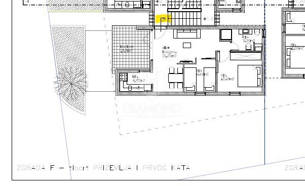 The apartment is located on the first floor of a modern building with a total of 4 units. The total area of the living space is 72 m2, of which the area of the apartment is 49m2. It consists of a living room with an open kitchen and dining room, 2 bedrooms and a bathroom. From the living room there is access to the spacious balcony.