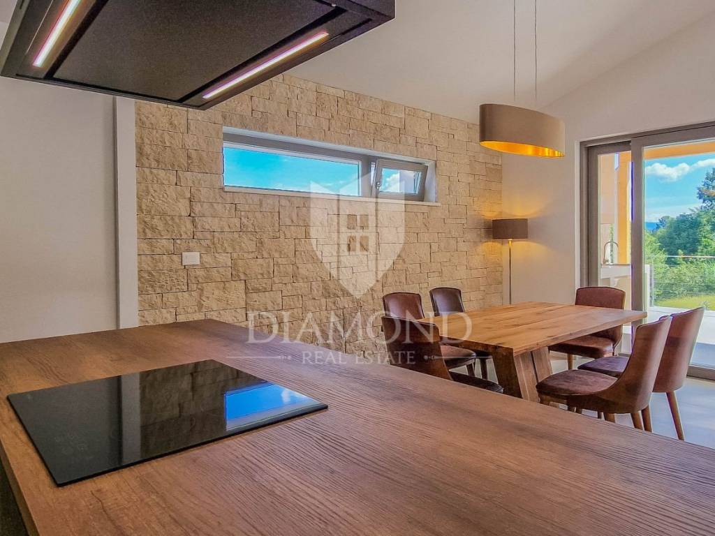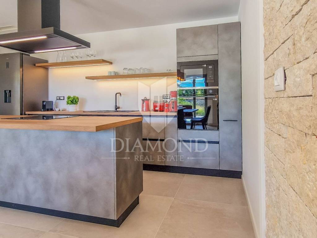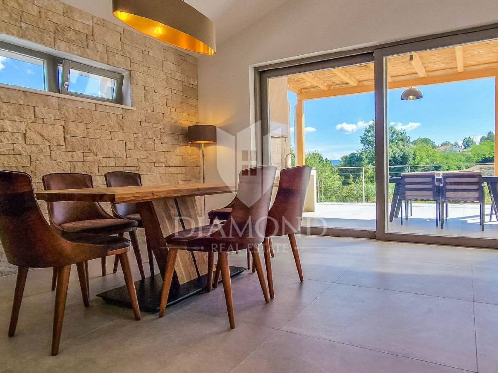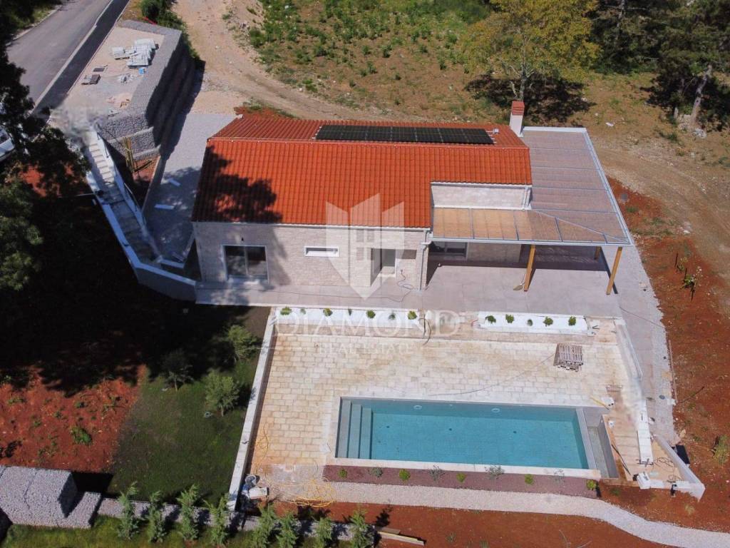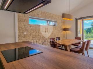 Istria, Motovun, Surroundings A rarity on the market, a beautiful villa for sale with an open view of Motovun. The total size of the villa is 201 m2, it was built on a plot of 1043 m2, the interior of the villa is 158 m2, a terrace of 43 m2 and an outdoor heated pool of 27 m2. The villa consists of an entrance, 2 bedrooms, 3 bathrooms, 1 toilet, open space living room with kitchen, storage room, large terrace with preparation for summer kitchen, outdoor heated pool, 2 parking spaces and space for additional content at the request of the client. An additional space of 50 m2 with its own bathroom allows the owner to create additional content depending on the need, such as a wine cellar, a game room, an office or an additional bedroom. Additional space is located under the terrace. The property is under construction, the expected completion of the works is 2Q/2025, sold on a turnkey basis. The price includes a solar power plant that will be installed on the roof of the property and horticulture is also included in the price. The villa is located in a quiet village not far from Motovun, from the pool there is a beautiful open view of Motovun and the surrounding hills, a real rarity on the market. The nature and greenery that surrounds the property has a relaxing effect and provides the new owners with real pleasure during their stay in the property. Underfloor heating is installed throughout the entire property, and cooling is via air conditioning. The property is ideal for clients who want a vacation villa in a peaceful and quiet place, surrounded by nature with a beautiful view, or for clients who want to invest in real estate and deal with tourist rentals in order to achieve a faster return on investment.