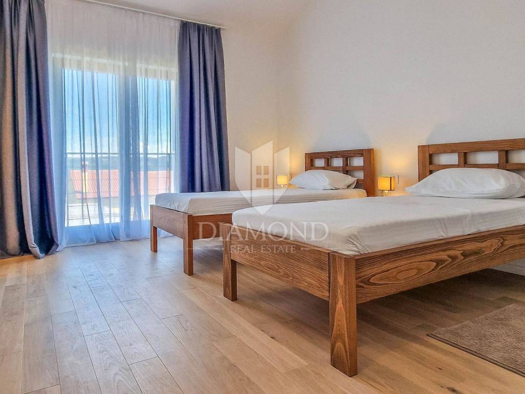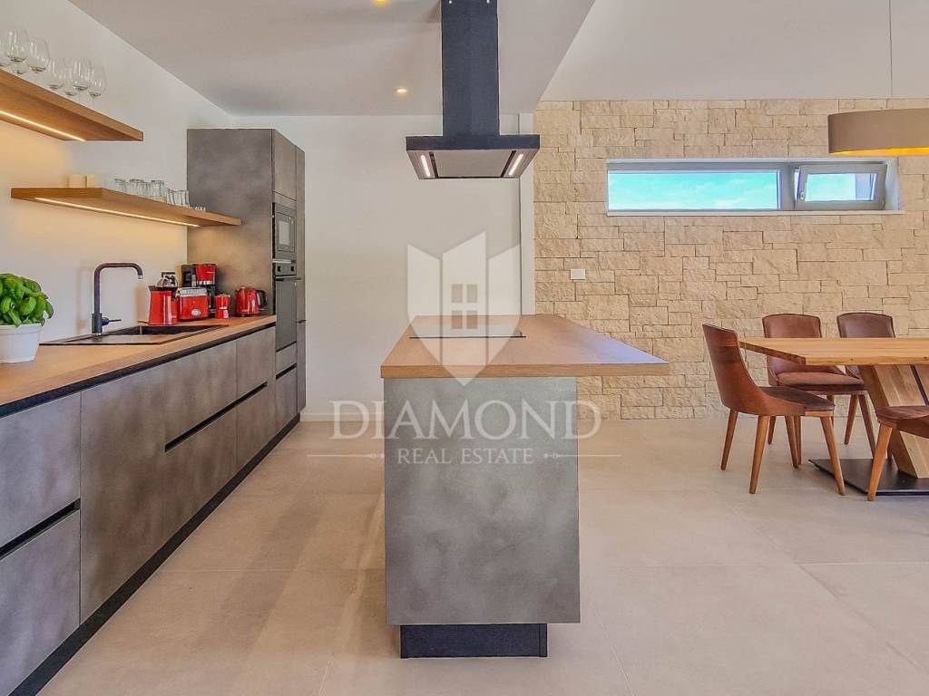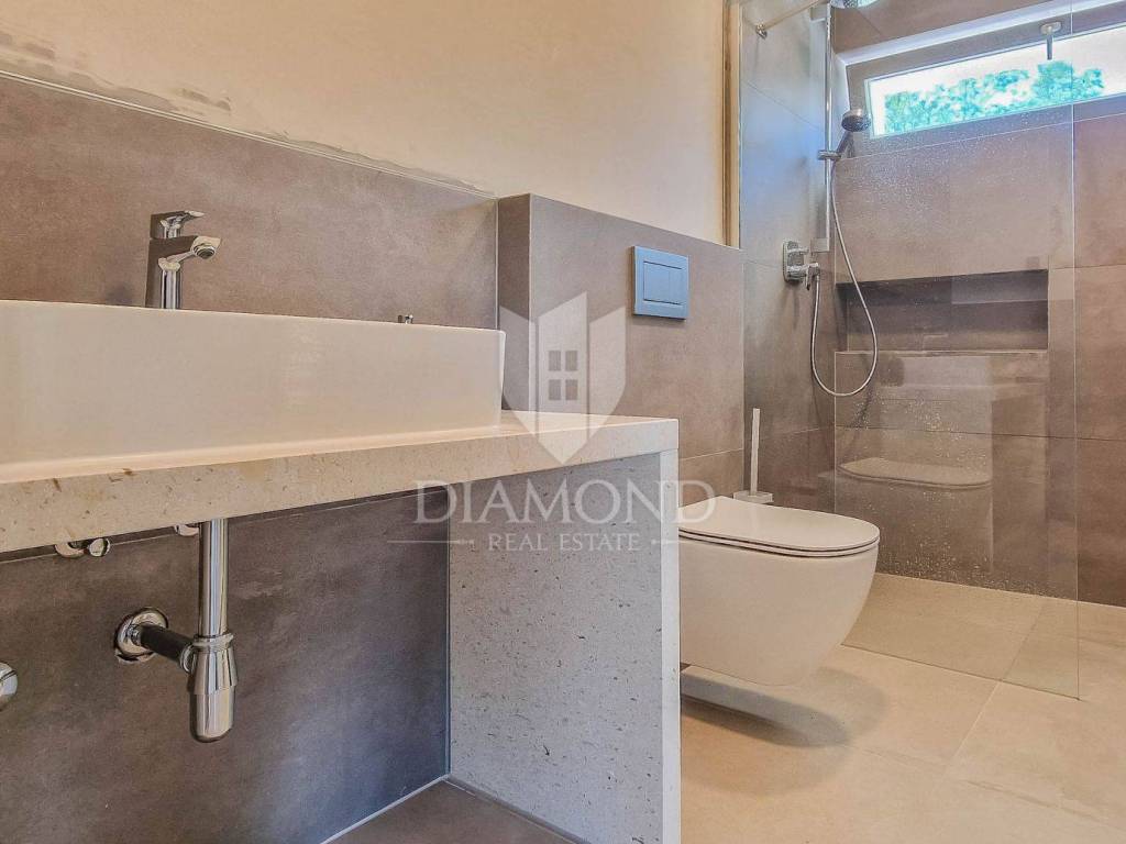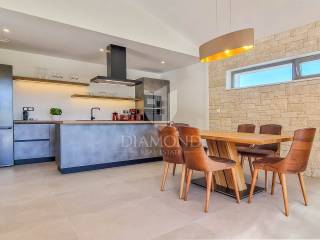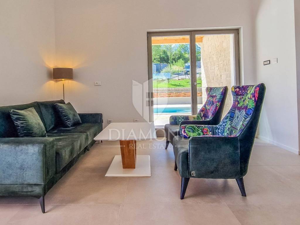 Istria, Motovun, Surroundings A rarity on the market, a beautiful villa for sale with an open view of Motovun. The total size of the villa is 201 m2, it was built on a plot of 1043 m2, the interior of the villa is 158 m2, a terrace of 43 m2 and an outdoor heated pool of 27 m2. The villa consists of an entrance, 2 bedrooms, 3 bathrooms, 1 toilet, open space living room with kitchen, storage room, large terrace with preparation for summer kitchen, outdoor heated pool, 2 parking spaces and space for additional content at the request of the client. An additional space of 50 m2 with its own bathroom allows the owner to create additional content depending on the need, such as a wine cellar, a game room, an office or an additional bedroom. Additional space is located under the terrace. The property is under construction, the expected completion of the works is 2Q/2025, sold on a turnkey basis. The price includes a solar power plant that will be installed on the roof of the property and horticulture is also included in the price. The villa is located in a quiet village not far from Motovun, from the pool there is a beautiful open view of Motovun and the surrounding hills, a real rarity on the market. The nature and greenery that surrounds the property has a relaxing effect and provides the new owners with real pleasure during their stay in the property. Underfloor heating is installed throughout the entire property, and cooling is via air conditioning. The property is ideal for clients who want a vacation villa in a peaceful and quiet place, surrounded by nature with a beautiful view, or for clients who want to invest in real estate and deal with tourist rentals in order to achieve a faster return on investment.