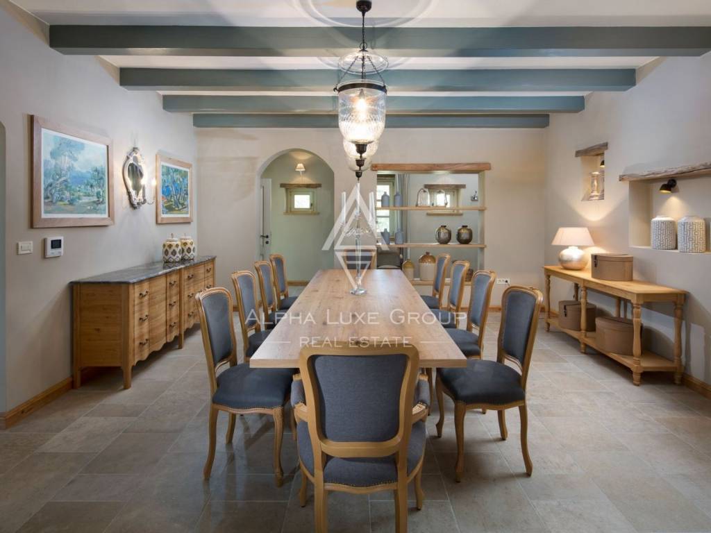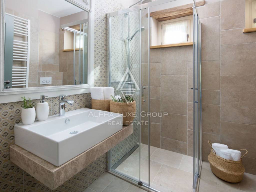The ground floor presents a lavish living room adorned with a fireplace, a dining area catering to 10 guests, a modern rustic kitchen, and two bedrooms with en-suite bathrooms; one featuring a double bed, and the other with twin beds. The first floor houses three double bedrooms, each with its own bathroom and double beds. Two of these bedrooms offer access to terraces, providing splendid views of the lush greenery, the sea, and distant Rovinj.
