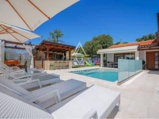 A swimming pool and a summer kitchen are located in the landscaped yard.