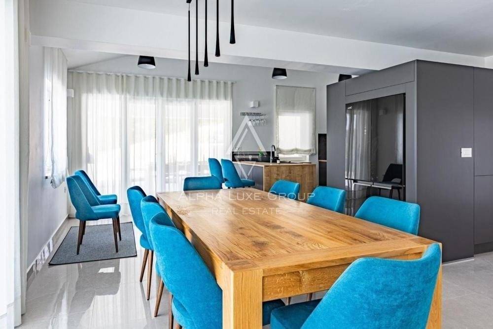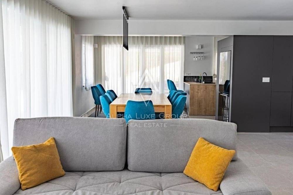 The villa's ground floor consists of a living room and an open space kitchen, two toilets, a storage room, and a smaller room that can be a salt room or a sauna in the future, depending on the preferences of the future owner.
