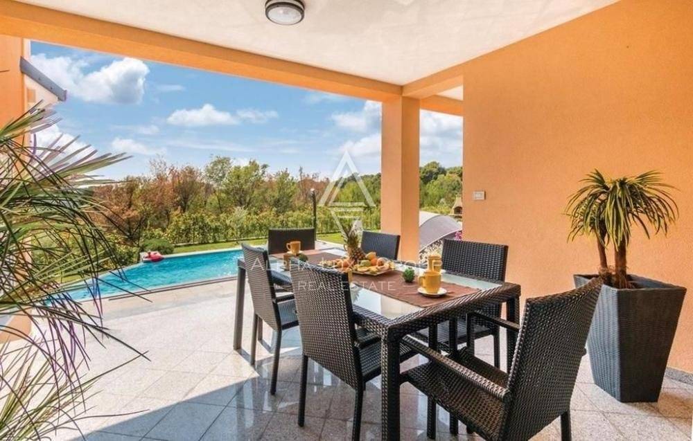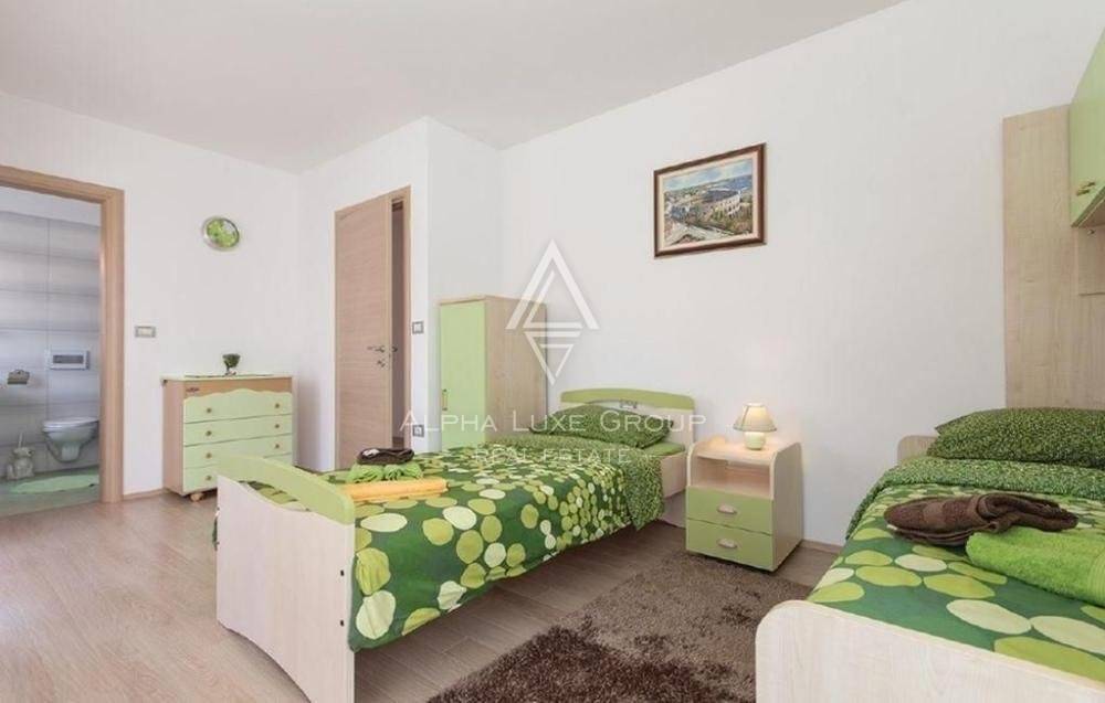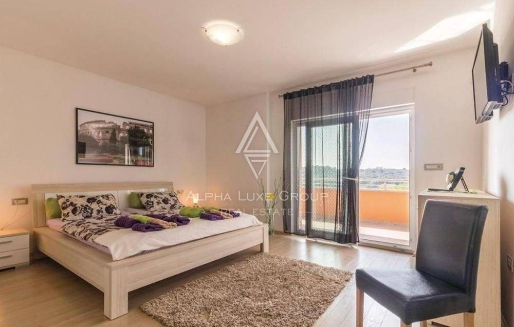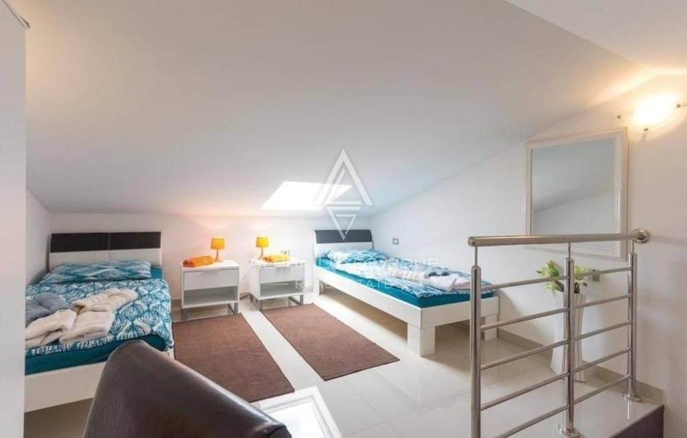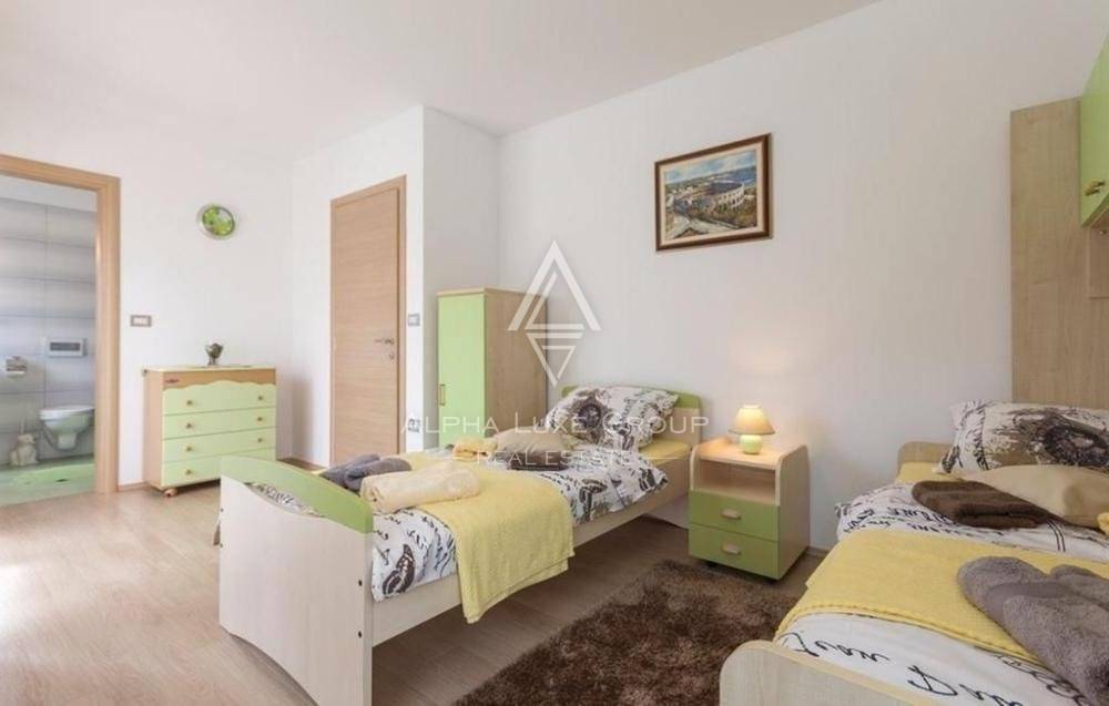 A study, four bedrooms, and a terrace exit are on the first floor. One of the bedrooms is in the attic. All of the rooms have central heating and are air-conditioned. The beds are linked by an elevator in addition to the internal stairwell. This structure also has a large covered terrace as a unique characteristic. The house is close to the marina but has access to various other attractions in ancient Pula, including cultural and historical sites.