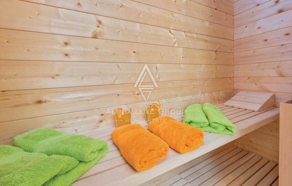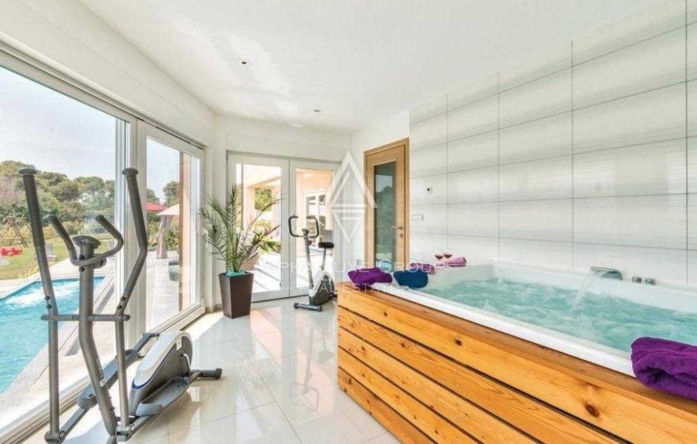 On the ground floor, a spacious living area with a modern kitchen and dining room connects to a large terrace with garden furniture and a pavilion. On the ground level, a relaxation area with large glass walls overlooks the pool, patios, and gardens. The collection has a 48 square meters in size hydromassage, with a section for children measuring 0.5 meters deep and an adult section measuring 1.5 meters deep.