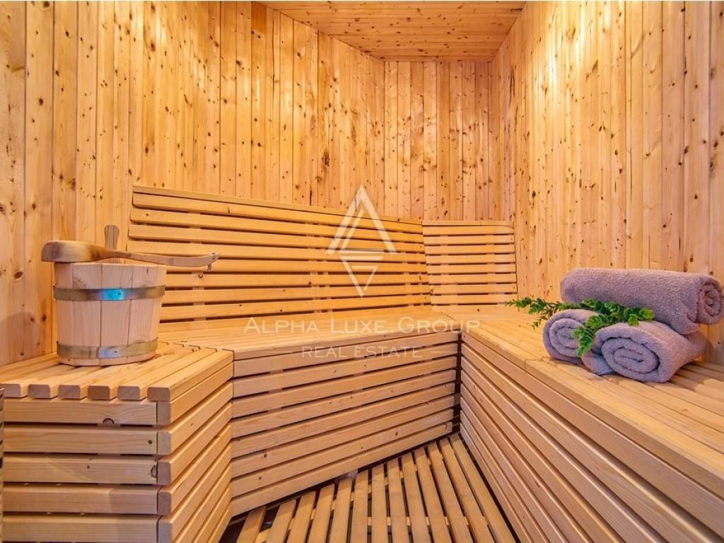 On the ground floor is a spacious living room with a kitchen and dining room, two bedrooms, and two bathrooms. There is also a sauna and a lounge overlooking the pool.