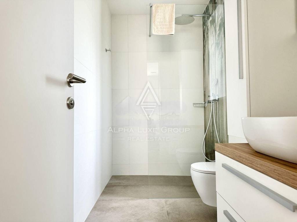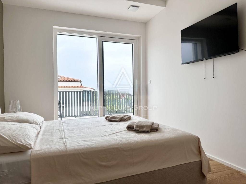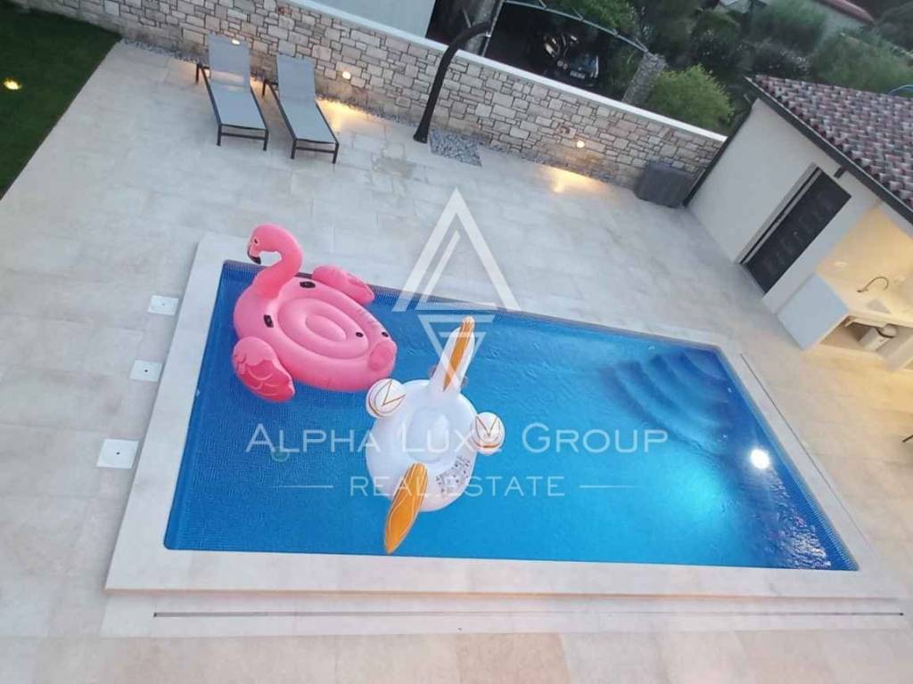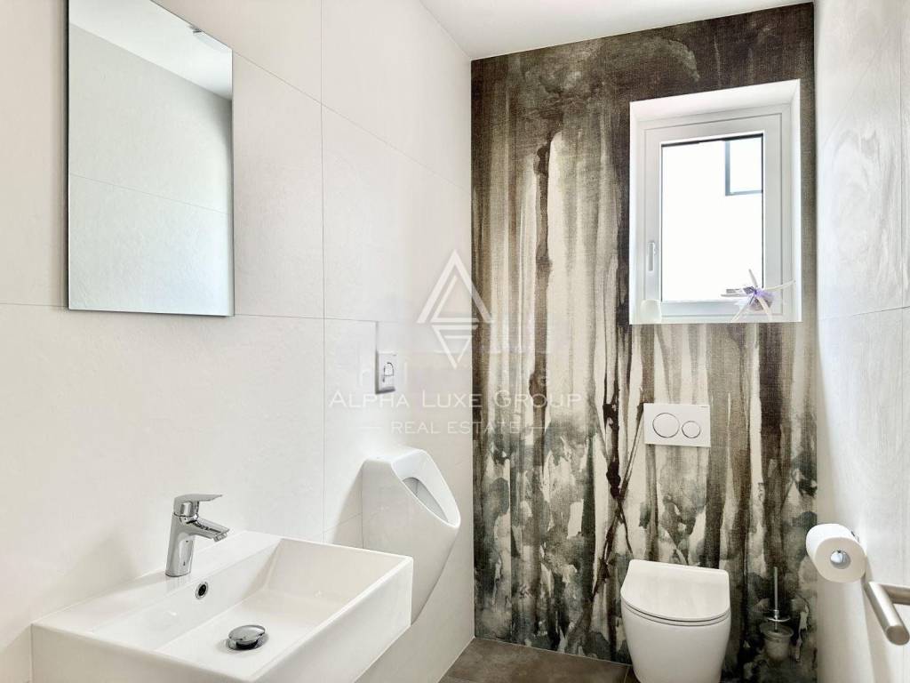 Experience the perfect blend of modern sophistication and tranquility with the villa's spacious and well-lit living room, opening onto a sheltered terrace where the breeze whispers tales of the Adriatic. The chic kitchen, a commodious bedroom, a refined bathroom, and an additional guest toilet all reside on the ground floor, while an artistic staircase ascends to the upper echelon of comfort. Here, three deluxe bedrooms each feature personal bathrooms and access to a majestic balcony that frames the panoramic seascape.