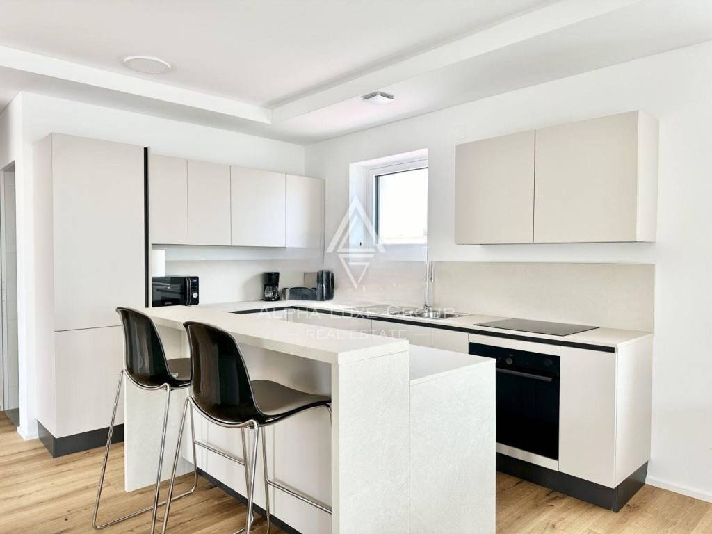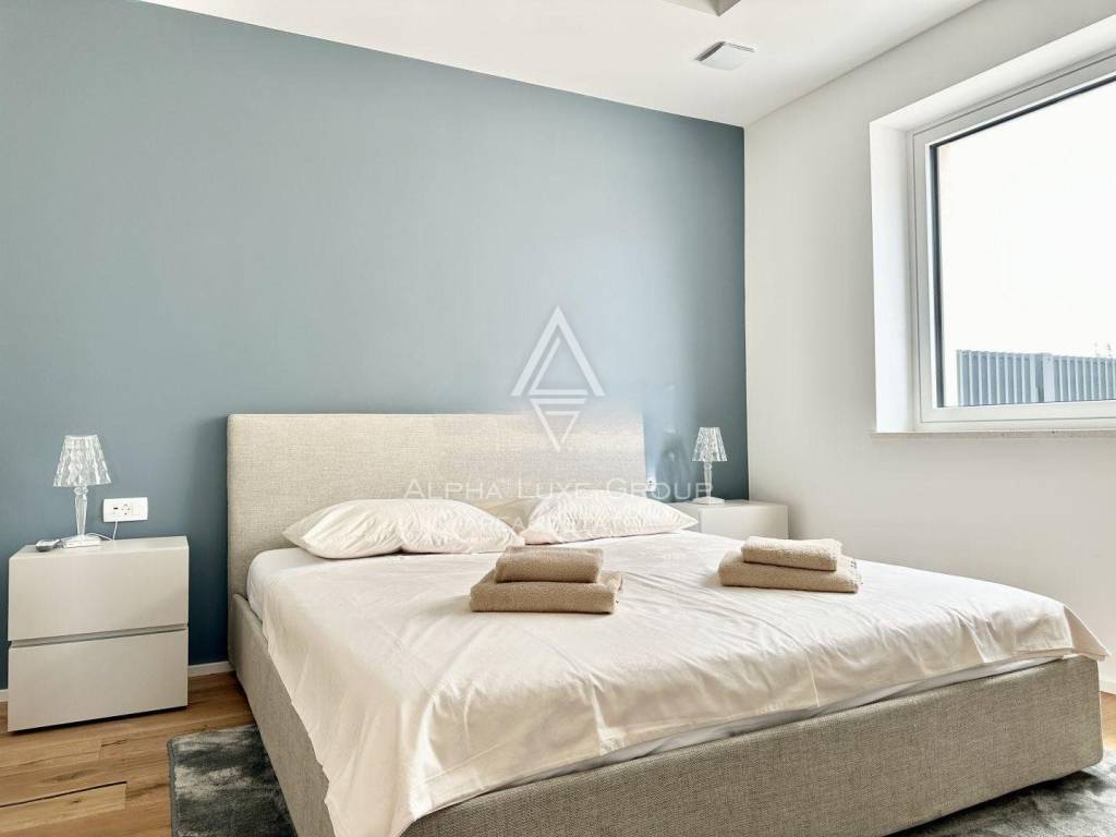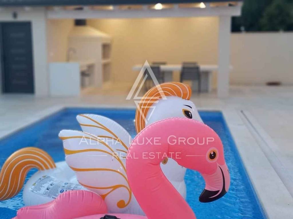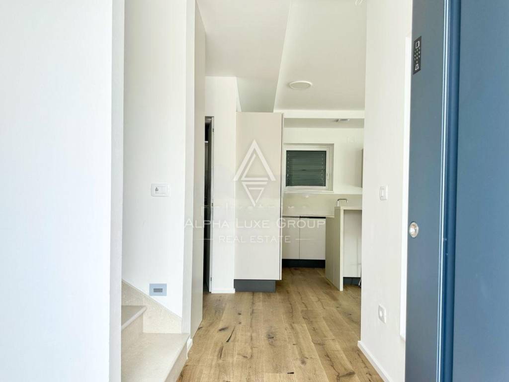 Experience the perfect blend of modern sophistication and tranquility with the villa's spacious and well-lit living room, opening onto a sheltered terrace where the breeze whispers tales of the Adriatic. The chic kitchen, a commodious bedroom, a refined bathroom, and an additional guest toilet all reside on the ground floor, while an artistic staircase ascends to the upper echelon of comfort. Here, three deluxe bedrooms each feature personal bathrooms and access to a majestic balcony that frames the panoramic seascape.