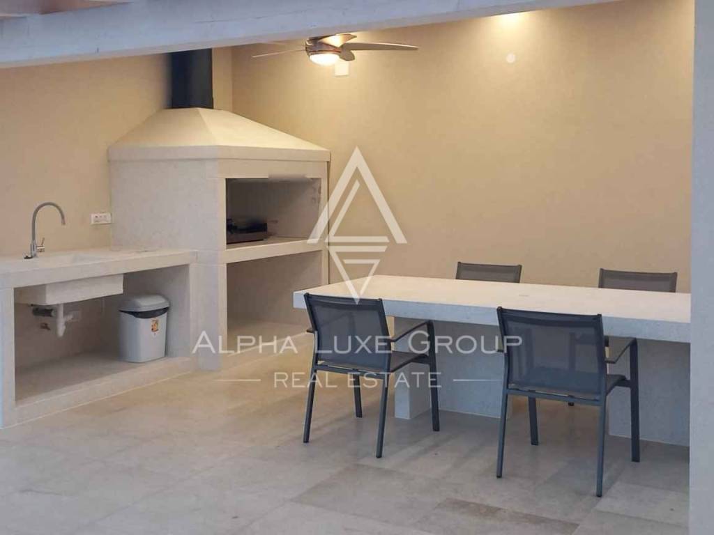Outdoors, the villa's private garden is a narrative of leisure and indulgence, complete with a pool that glistens under the sun, a sun deck crafted for repose, an al fresco kitchen, and an inviting green space. With two private parking spots, convenience is at your doorstep.