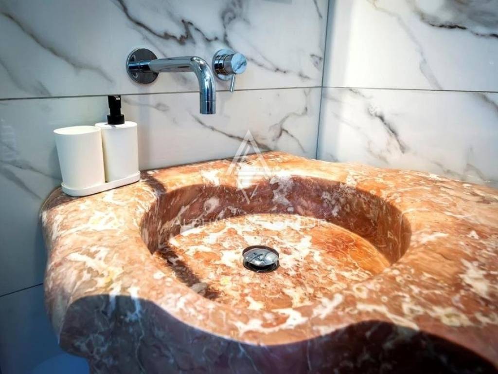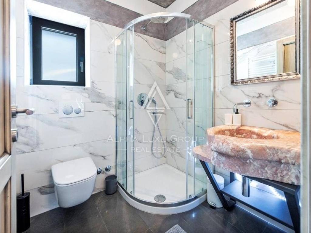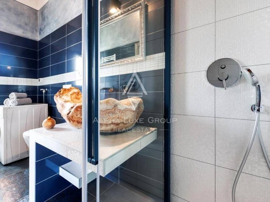 Bathrooms are equipped with "ONLY" retarders shower cabins, unique crystal-calcite sinks, and high-quality Catalano sanitary ware with Geberit Sigma cisterns. The living room features a thermal fireplace, central vacuum cleaning, and the house is serviced by a 300 l boiler plus a 400 l water storage unit for heating (Cordivari), with the option to add solar panels and a heat pump.