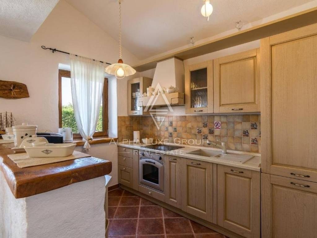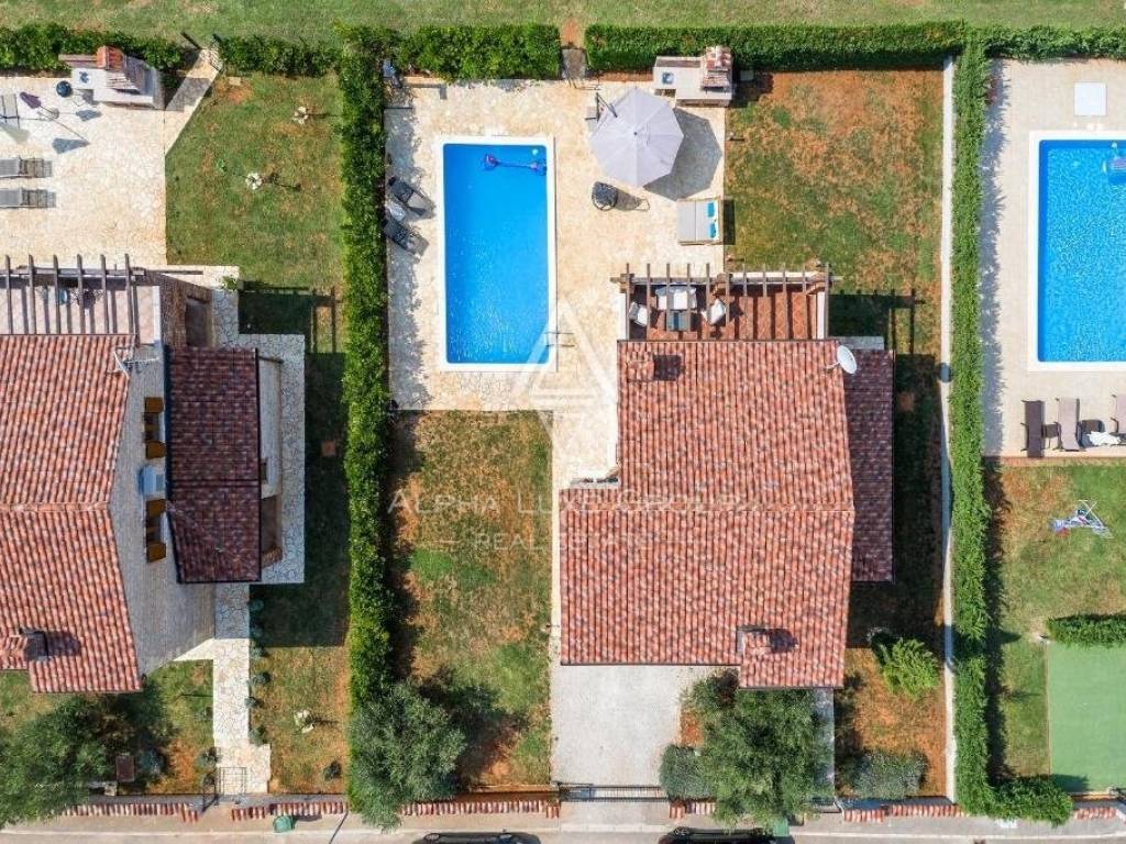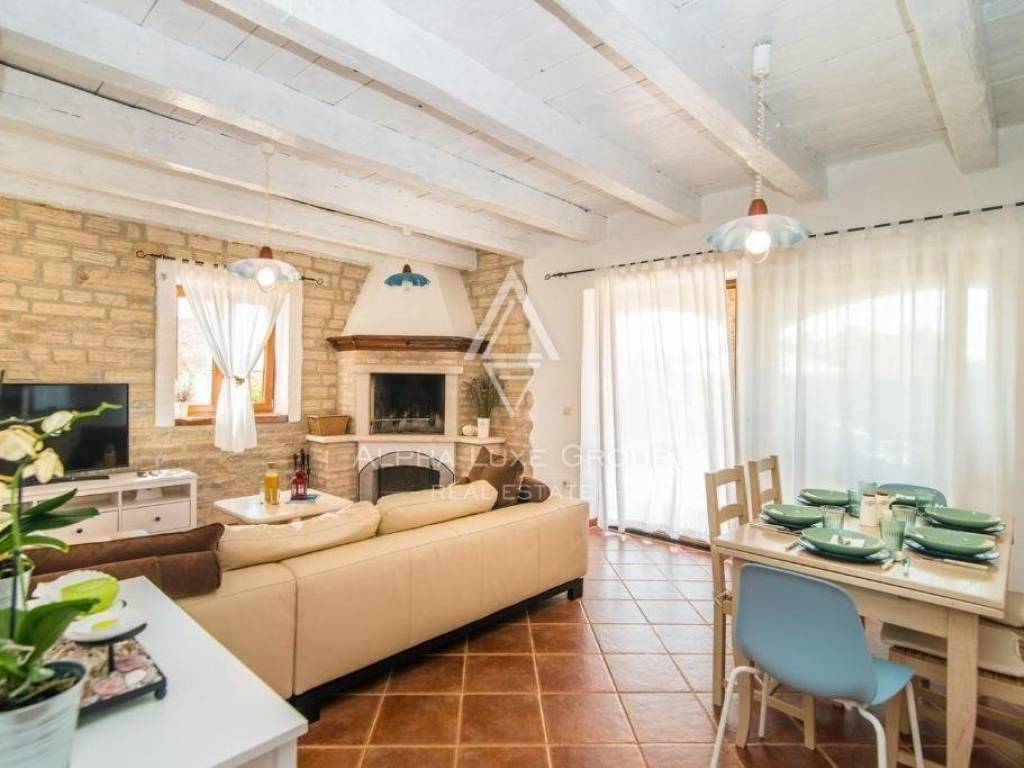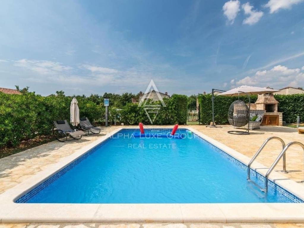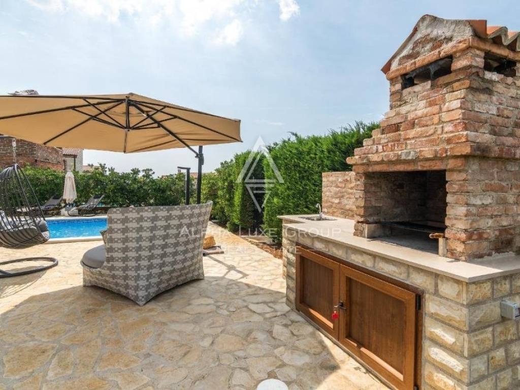 The villa is set on a lush 500m2 plot, featuring a 32m2 private pool with a sun deck and a charming summer kitchen with a grill, all enclosed by a stone wall for complete privacy. Located 20 km from Pula, 10 km from Vodnjan, and 15 km from Fažana.
