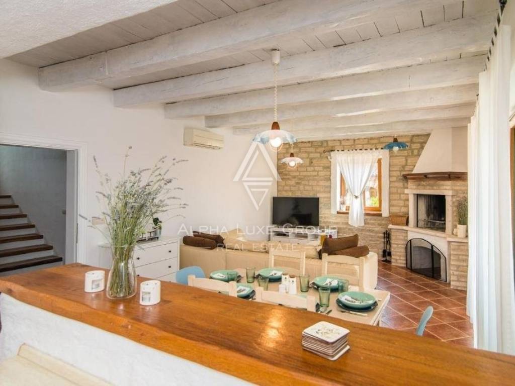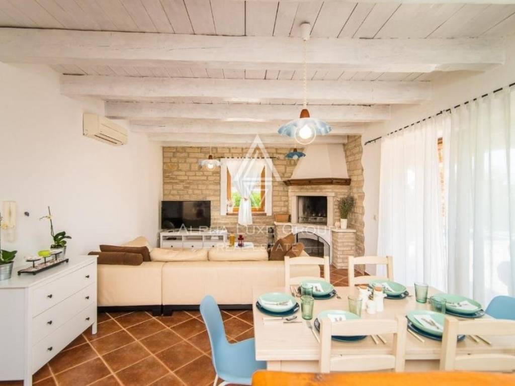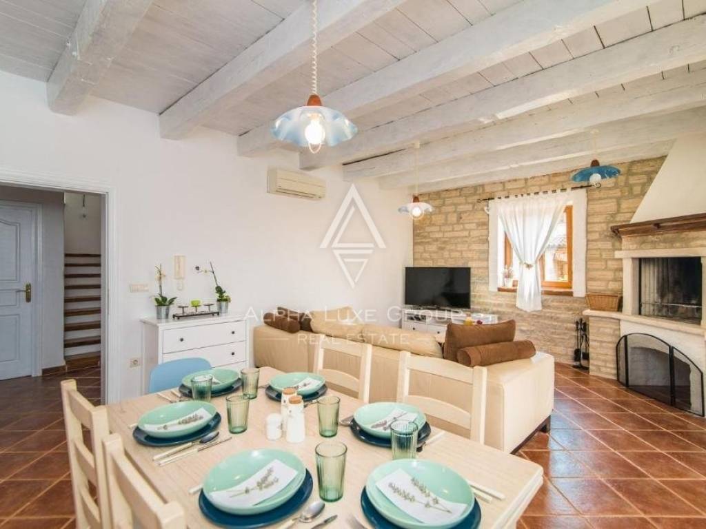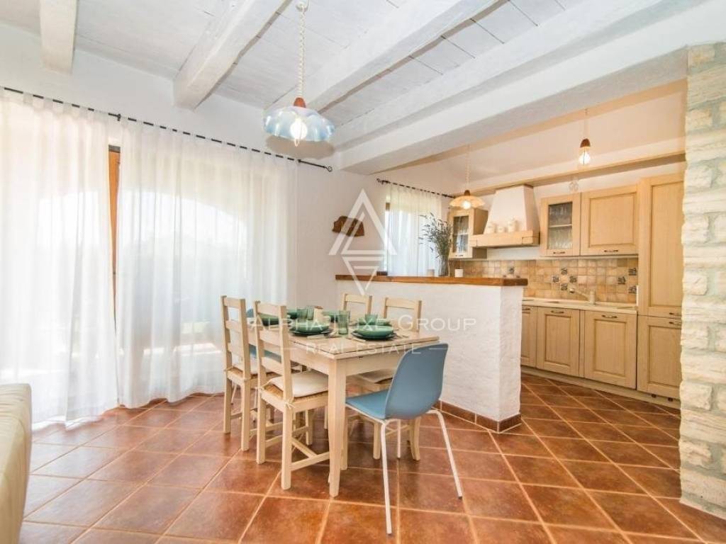 Located near Svetvinčenat's center and the town of Vodnjan, this exquisite villa covers 180m2 over two floors in a tranquil, private setting. The ground floor boasts a welcoming entrance hall leading to a sunlit living room with a functional wood-burning fireplace, a fully equipped kitchen, and a dining area. The living room opens onto a covered terrace, perfect for morning coffee or evening wine. A spacious bedroom with garden access, a large bathroom, and a convenient under-stairs storage complete this floor.