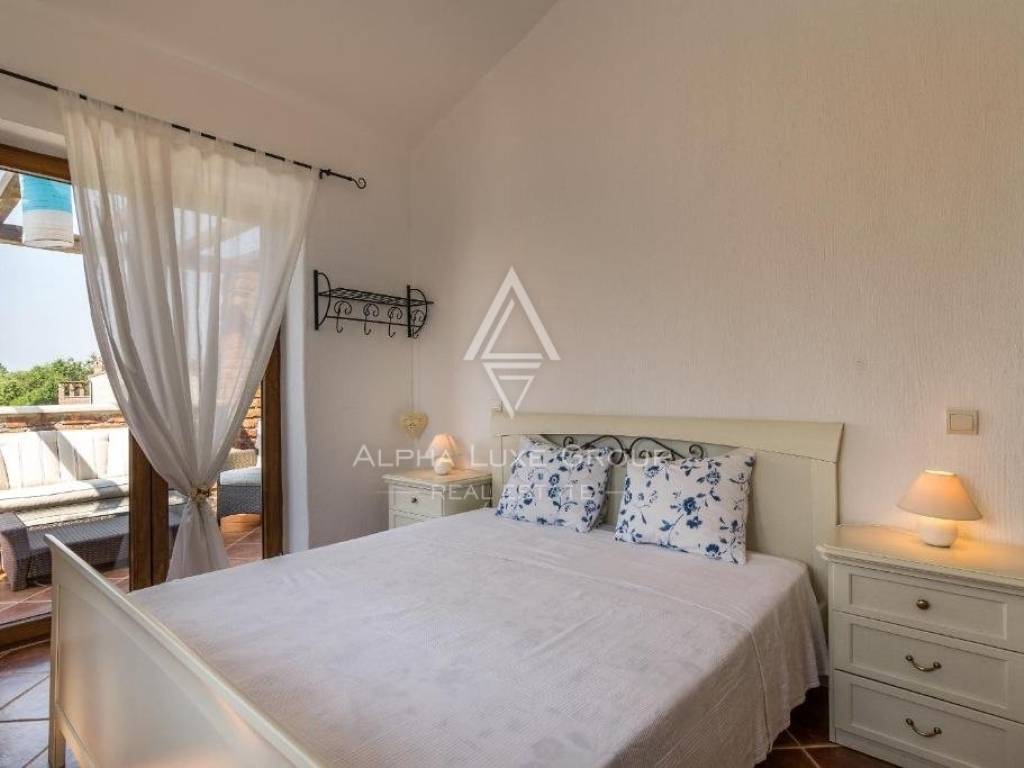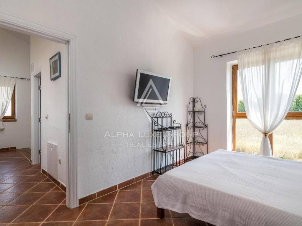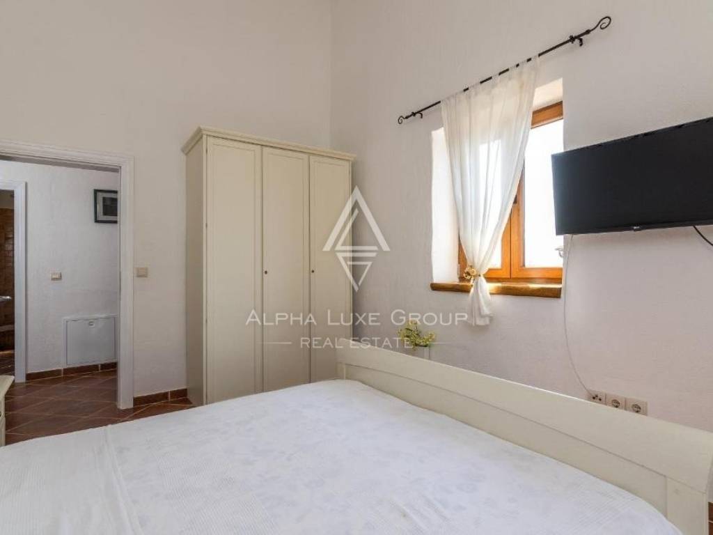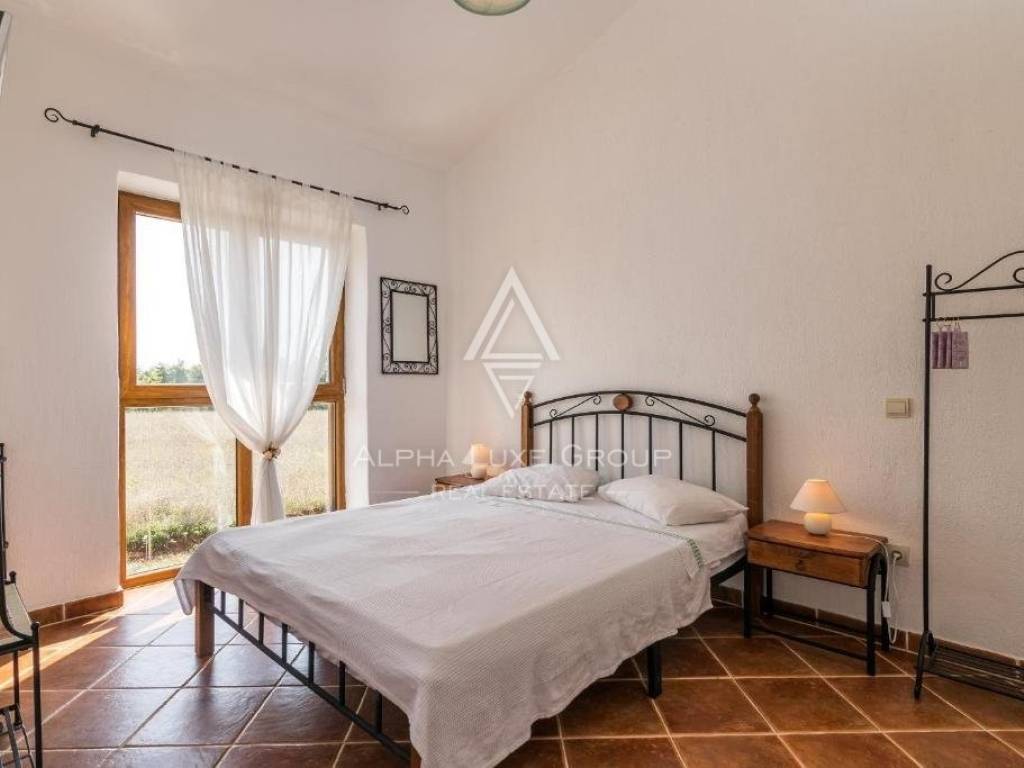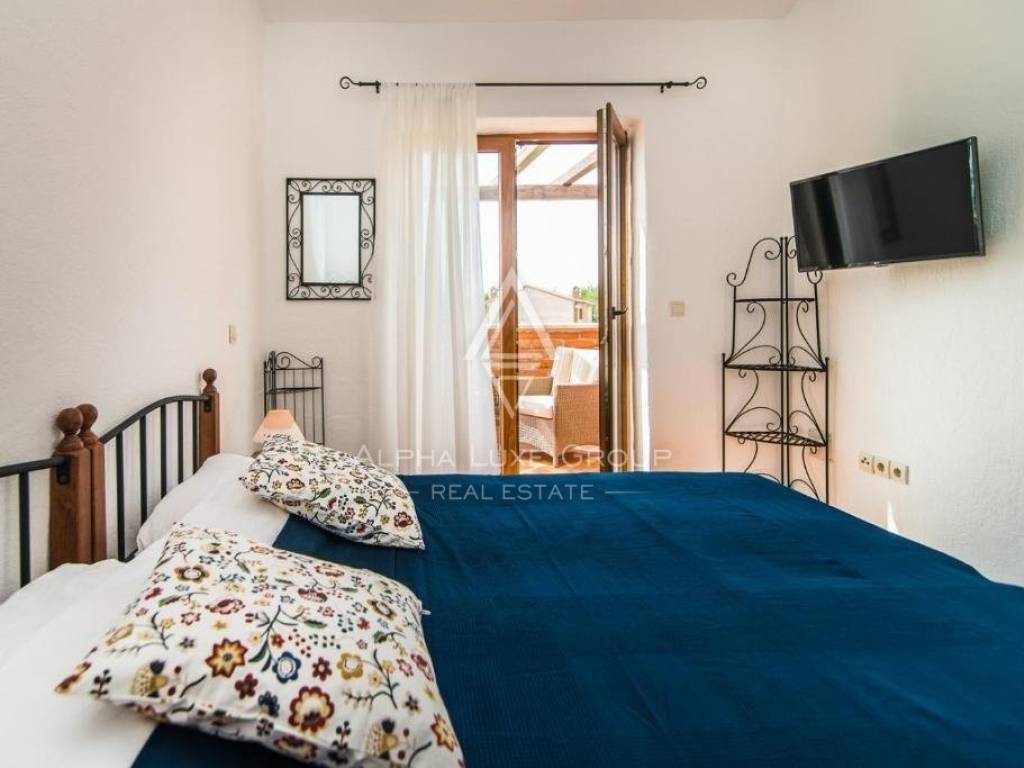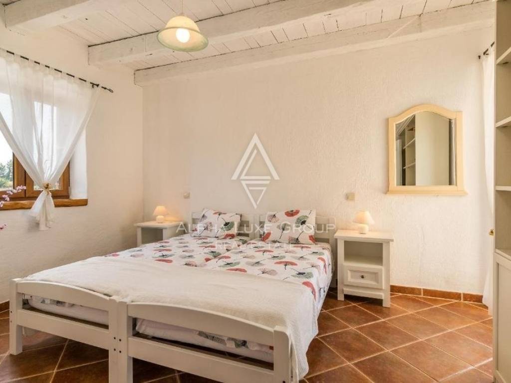 The internal staircase ascends to the first floor, housing three additional bedrooms. Two bedrooms share a sunny terrace, offering village vistas and unobstructed sea and Brijuni Islands views.