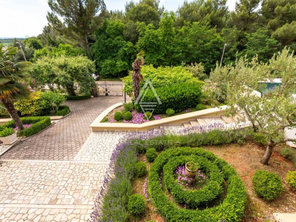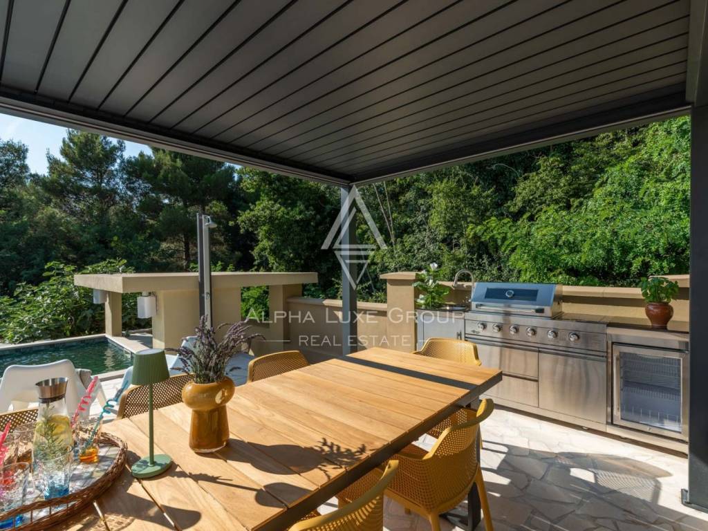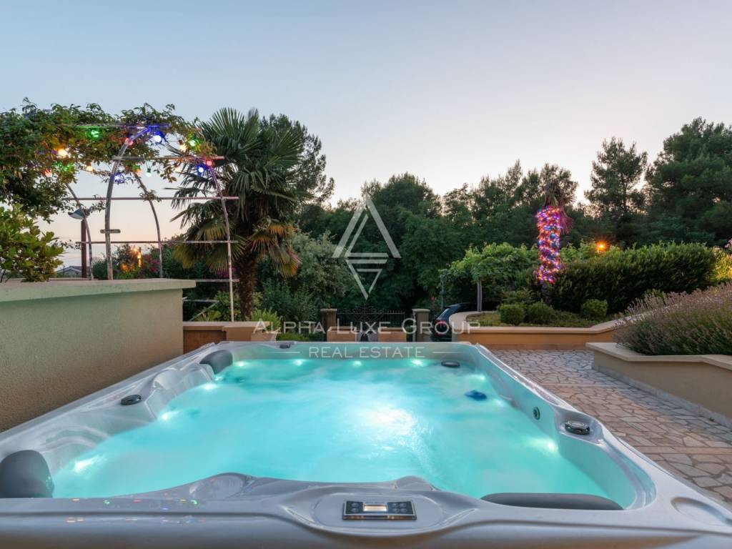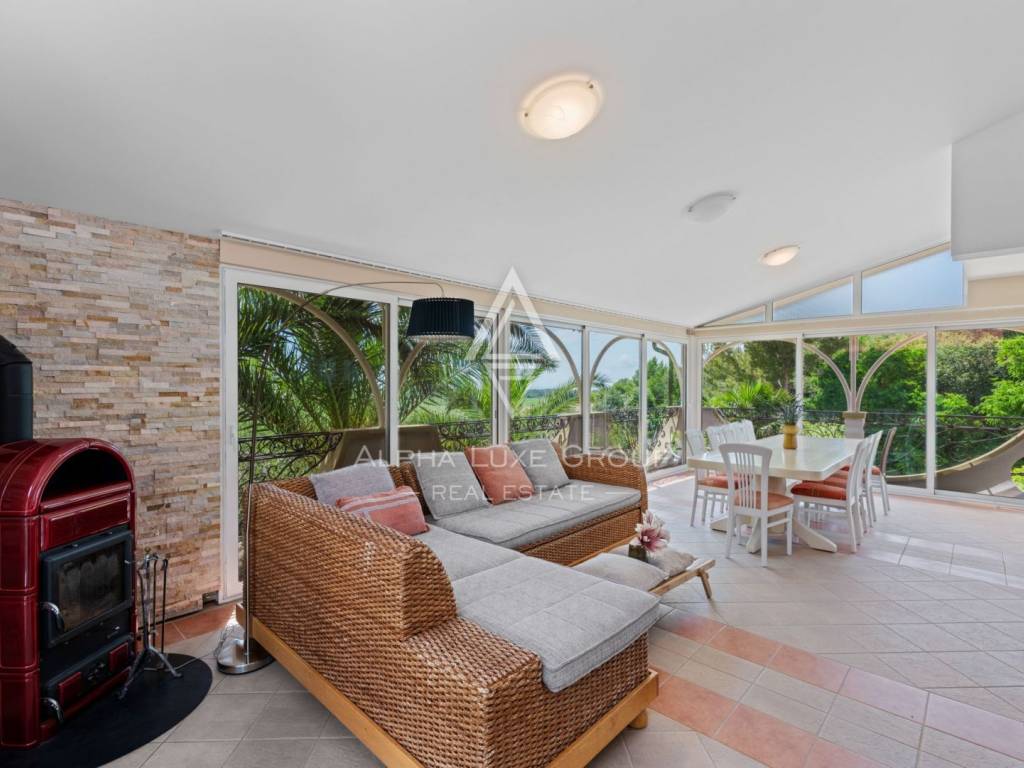 The spacious garden of this magnificent villa allows you to enjoy spending time with family and friends in the summer kitchen, where there is a barbecue with a dining table, swimming pool, and outdoor shower.