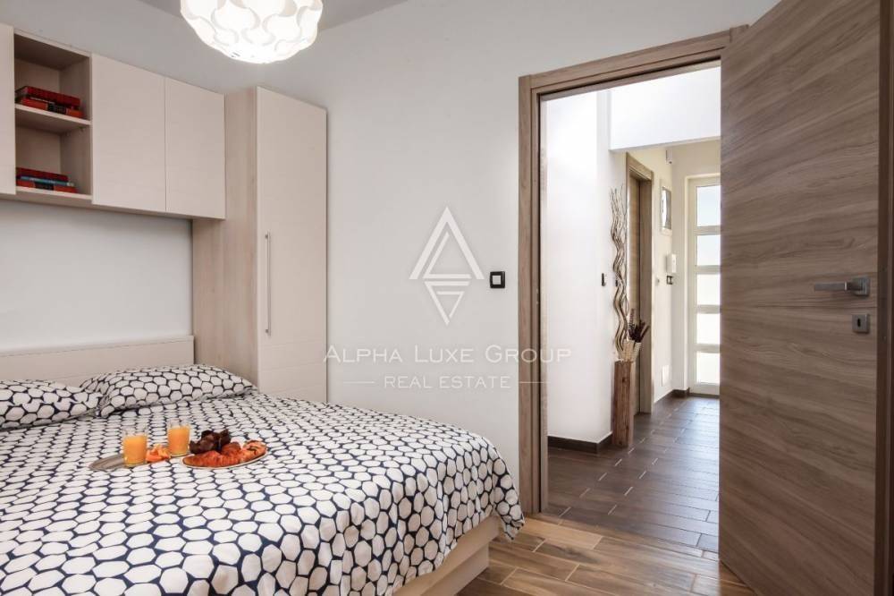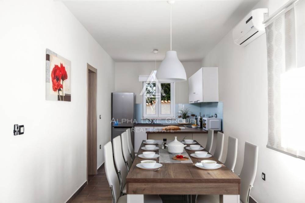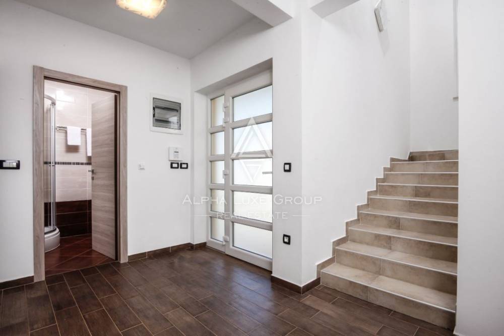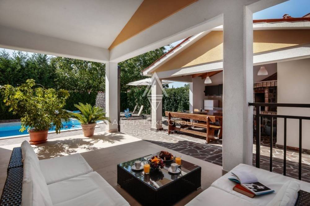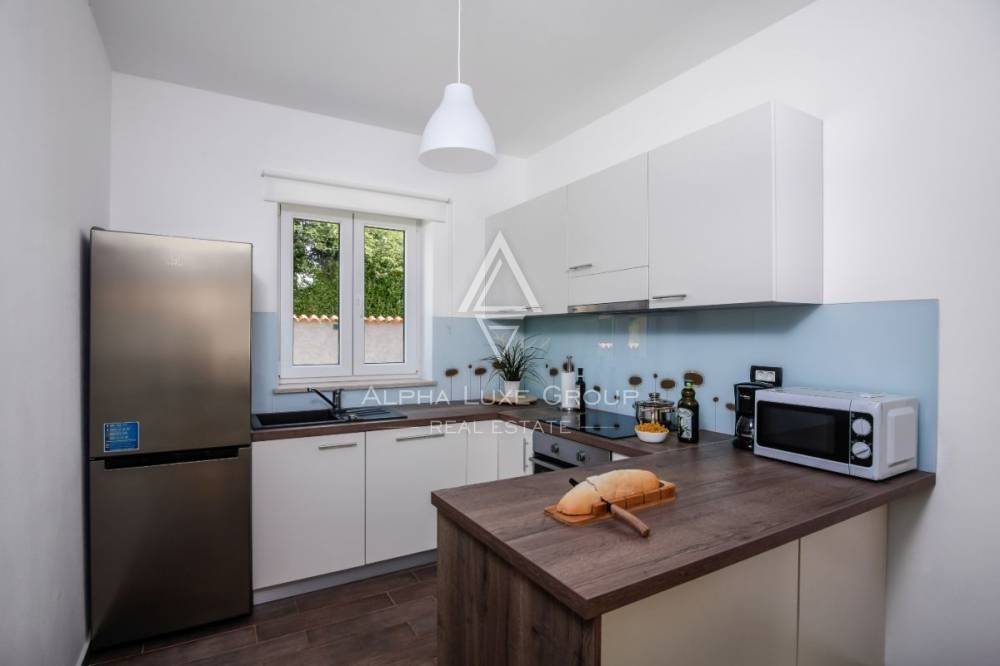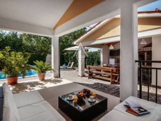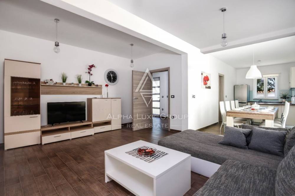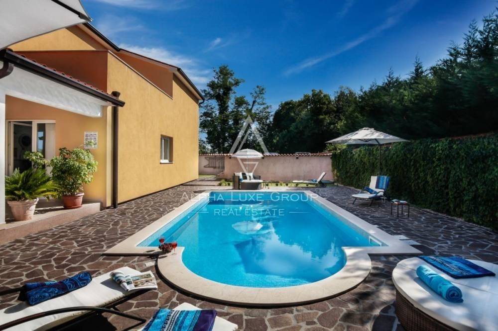 This residence with a swimming pool is located in a peaceful community near Labin. The house has a living area of 152m2 and 790 m2 of garden space. It has four bedrooms, two bathrooms, a fully equipped kitchen, dining room, and living room with access to an open covered terrace and pool of 28m2. It is made up of a ground floor and first level.