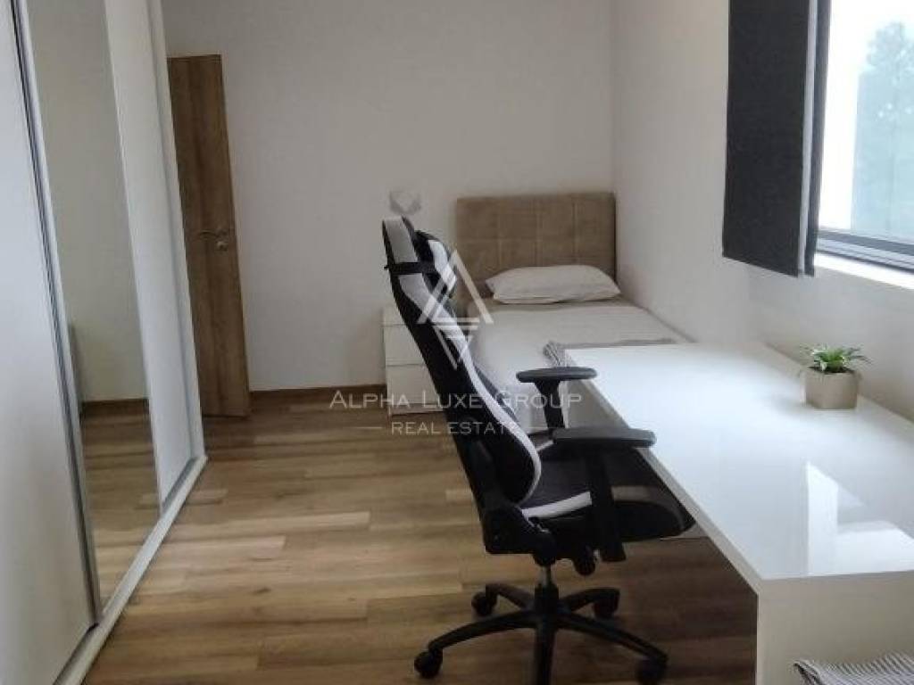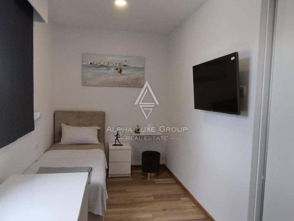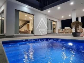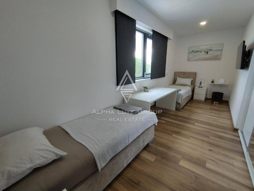 Upstairs, three air-conditioned bedrooms, each with television, share two modern bathrooms. The master suite enjoys underfloor heating in its bathroom, a walk-in wardrobe, and terrace access.