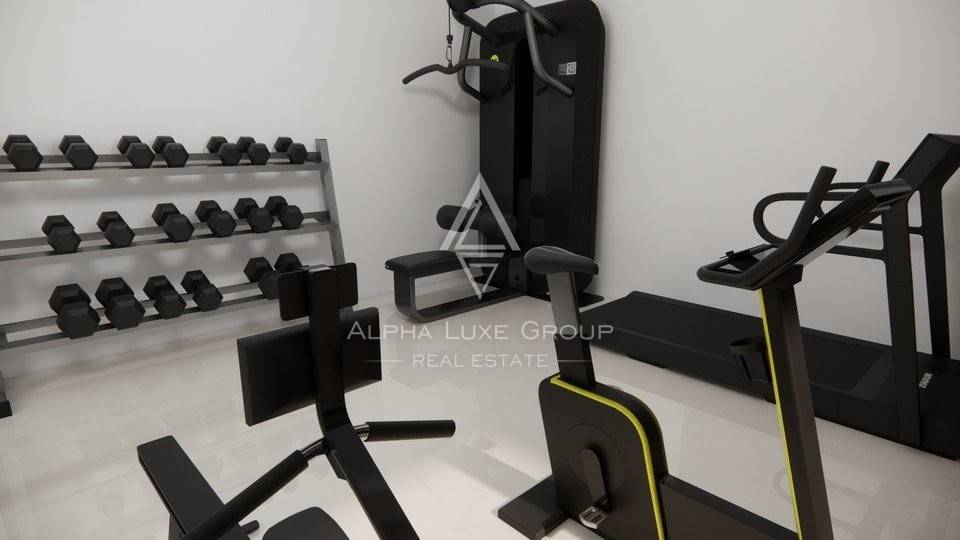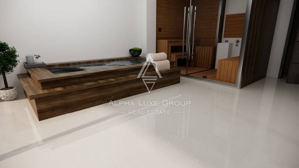 Ground Floor (177.10 m²): Experience seamless luxury in the expansive open-plan area featuring a living room with a fireplace, dining area, and kitchen. This level also includes a guest toilet, wellness space with a sauna and gym, a bedroom with an ensuite bathroom, a storage room, and a separate traditional tavern. Enormous glass walls open out to a covered terrace equipped with an outdoor kitchen and large dining setup adjacent to a heat-pump-heated swimming pool surrounded by a vast sunbathing area.