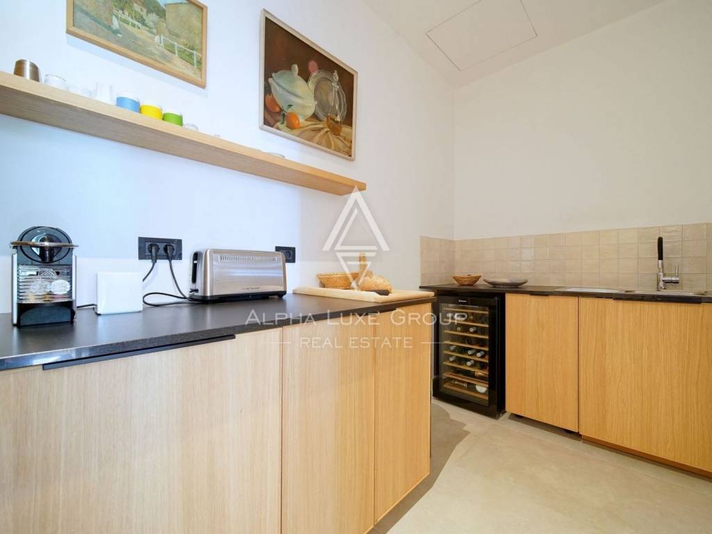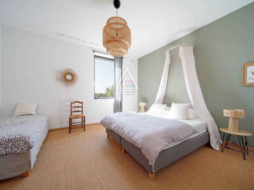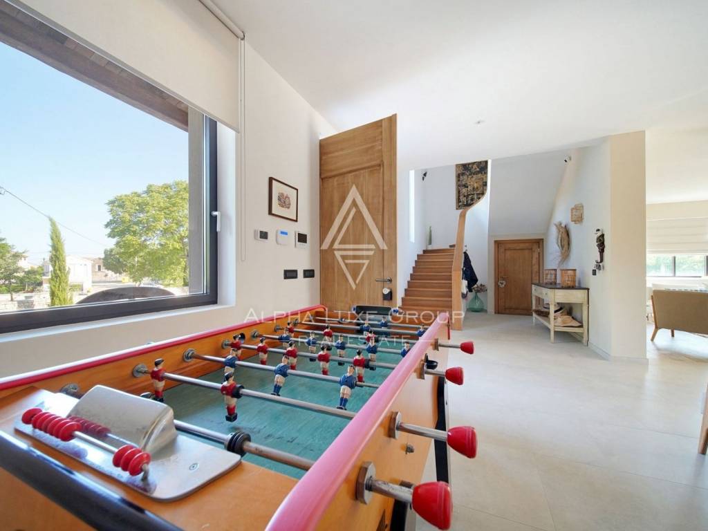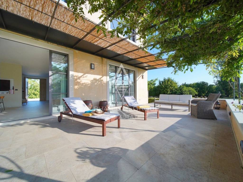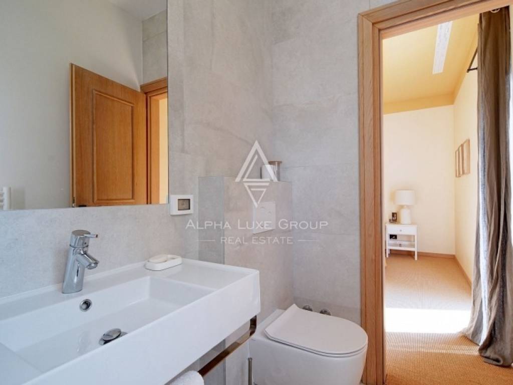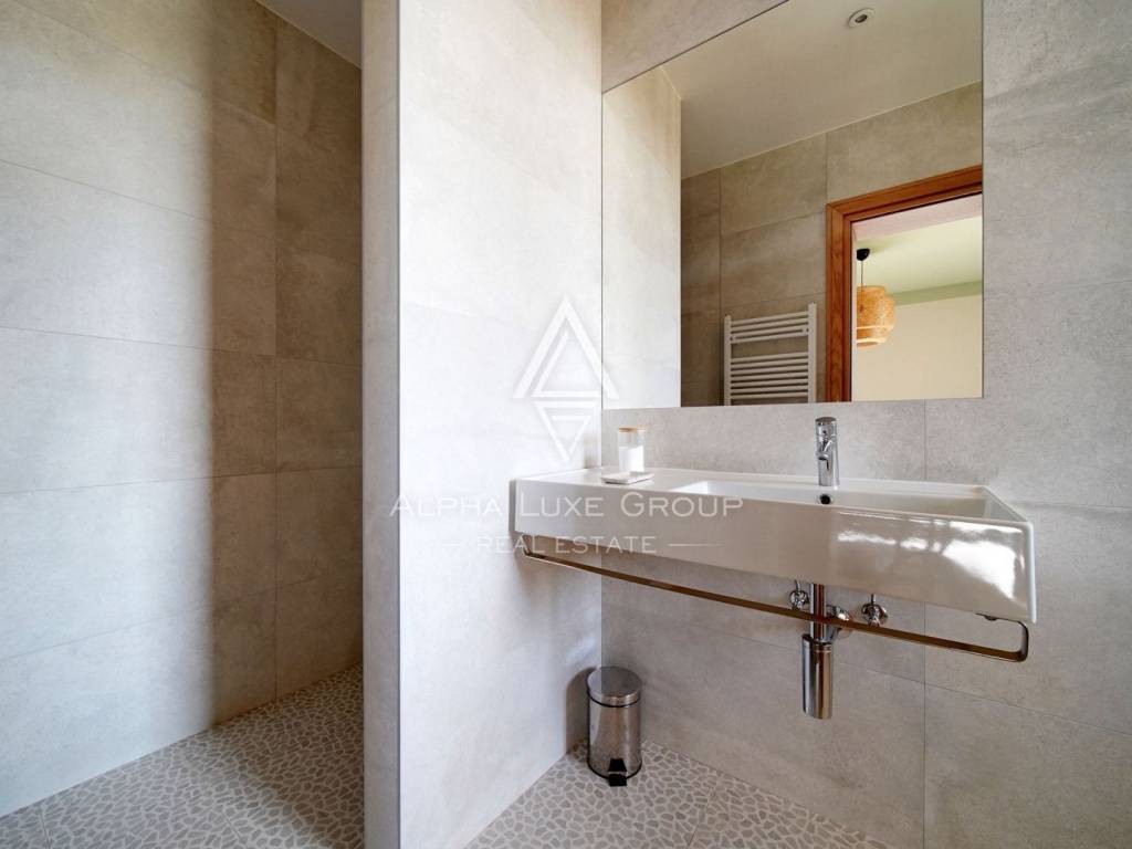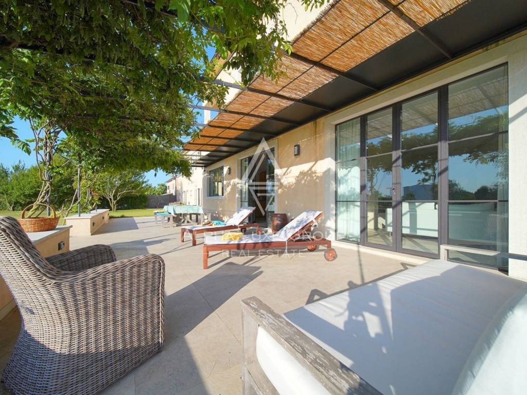 The outdoor area is designed to impress. A stunning 15 x 5 m swimming pool with a glass mosaic finish and a spacious covered terrace invites you to relax and entertain. The grounds feature manicured lawns, Mediterranean vegetation, automatic irrigation, and a bocce court for recreation.