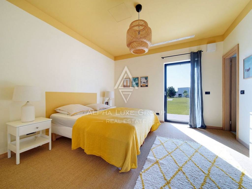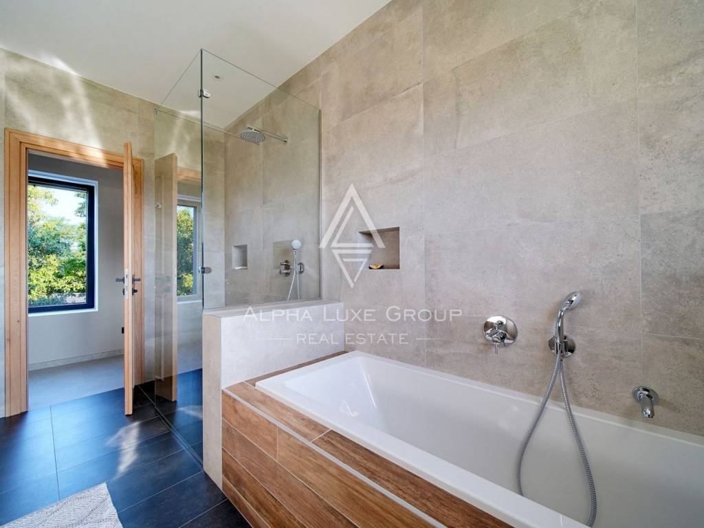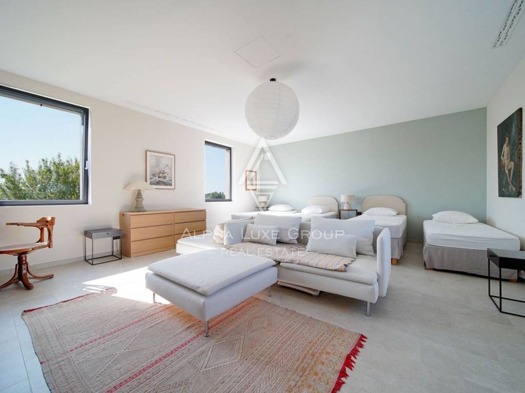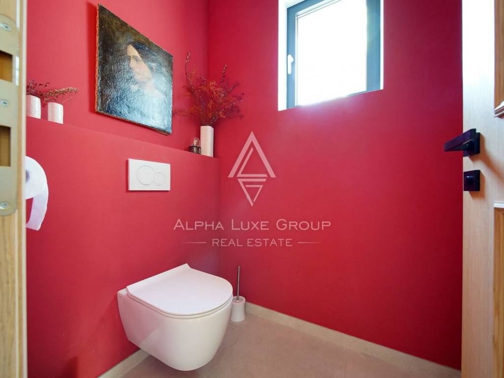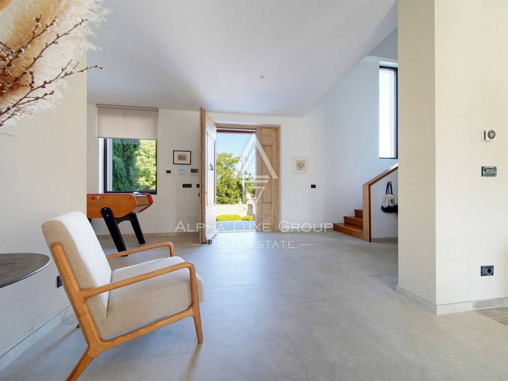 Inside, the villa is equipped with premium materials and smart features. Multi-zone Daikin air conditioning, a heat pump, mechanical ventilation, and underfloor heating ensure year-round comfort. Modern aluminum joinery with double glazing, Schüco profiles, custom wooden interior doors, and an electronic locking system enhance both security and aesthetics. Most of the furniture, including high-quality built-ins and designer pieces, is included in the sale.