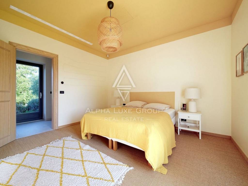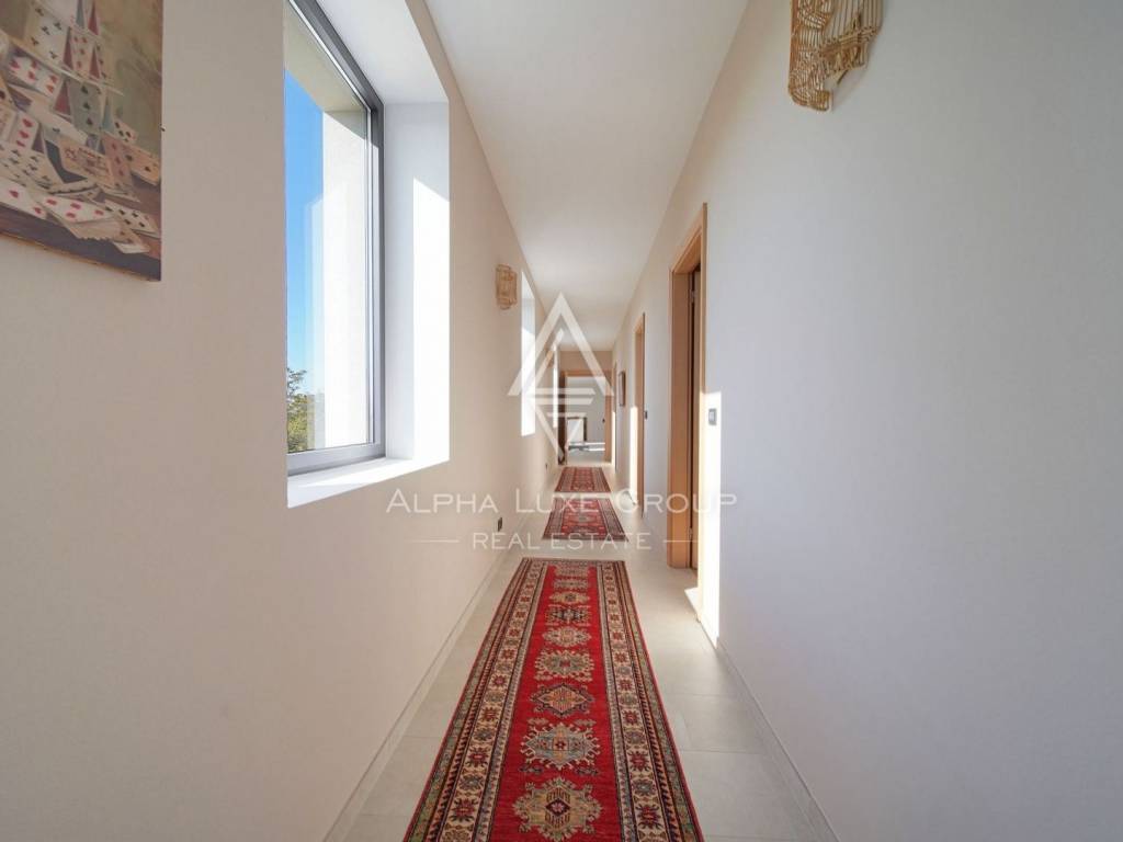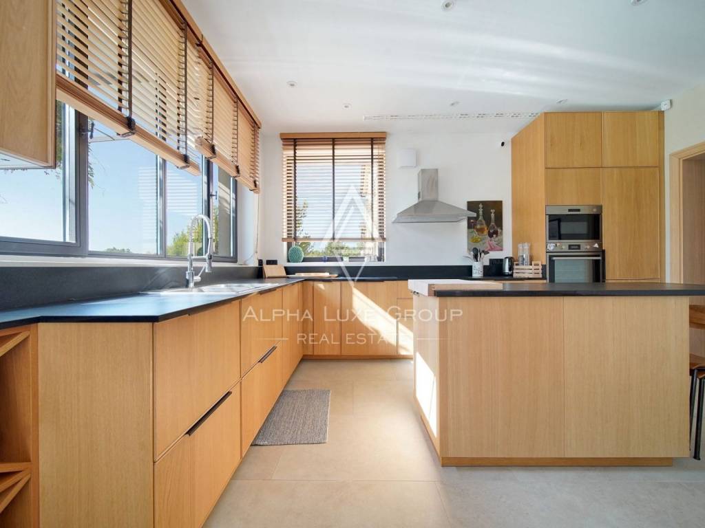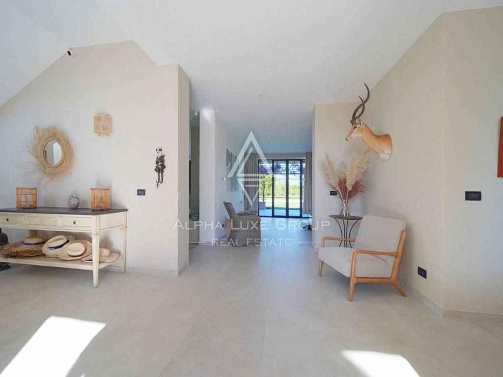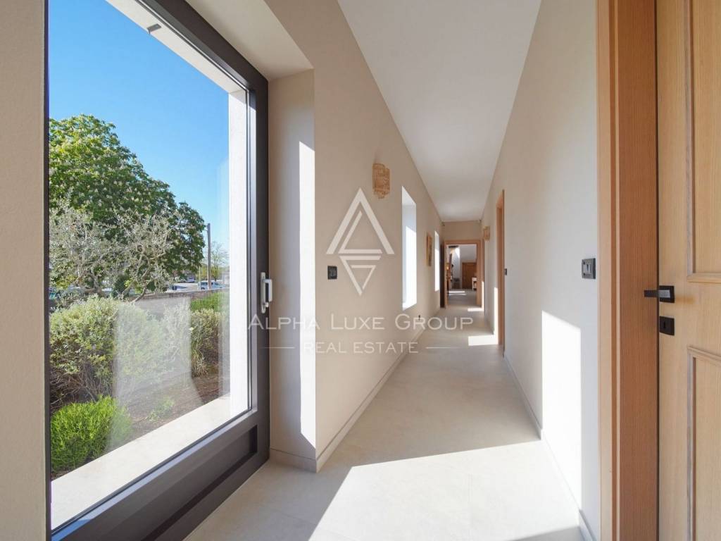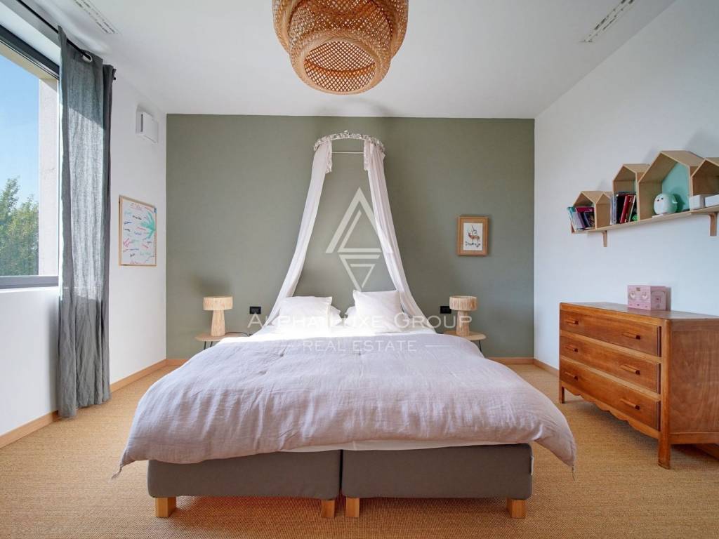 Inside, the villa is equipped with premium materials and smart features. Multi-zone Daikin air conditioning, a heat pump, mechanical ventilation, and underfloor heating ensure year-round comfort. Modern aluminum joinery with double glazing, Schüco profiles, custom wooden interior doors, and an electronic locking system enhance both security and aesthetics. Most of the furniture, including high-quality built-ins and designer pieces, is included in the sale.