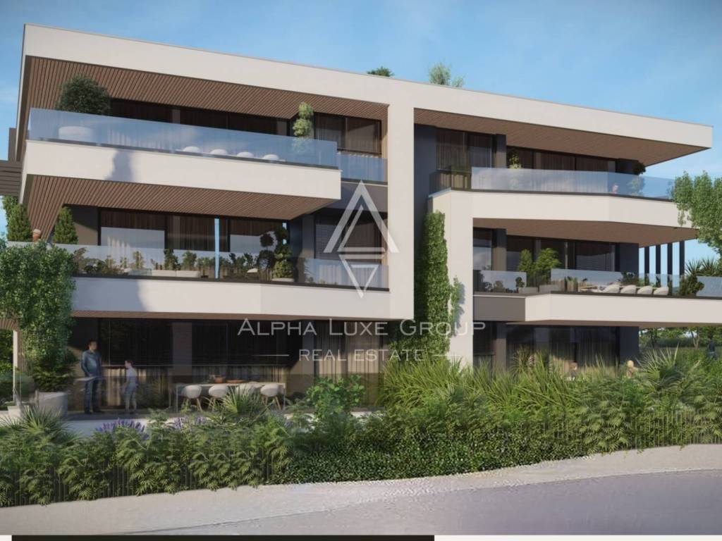 Ground floor apartment, 131.18 m2 with covered terrace, outdoor pool and garden on the ground floor consists of a hallway with wardrobe, 3 bedrooms, kitchen with dining room and living room, 2 bathrooms, toilet and storage. The apartment has two garage parking spaces.