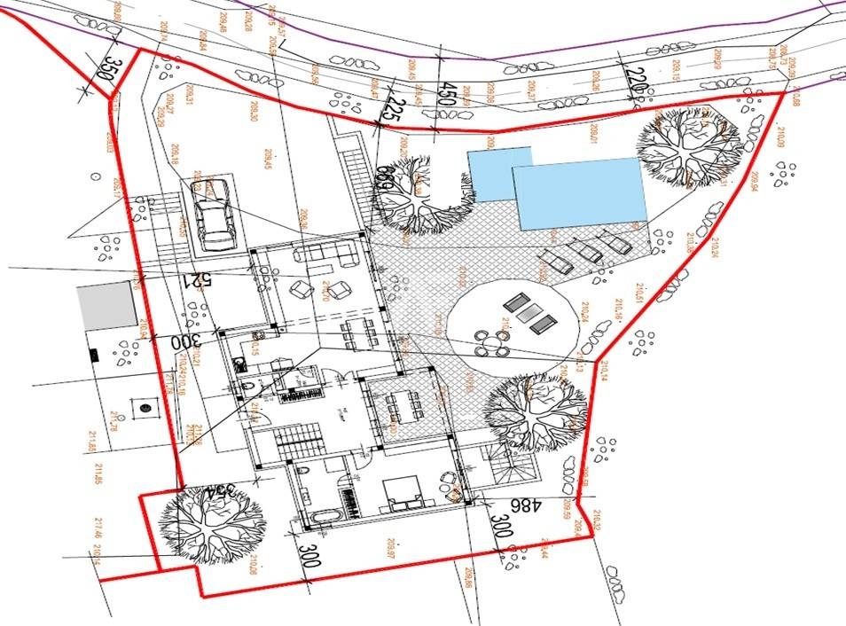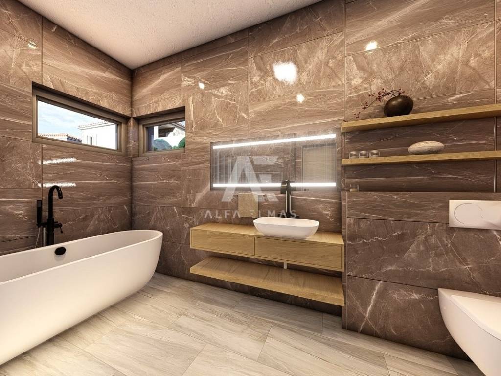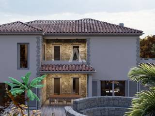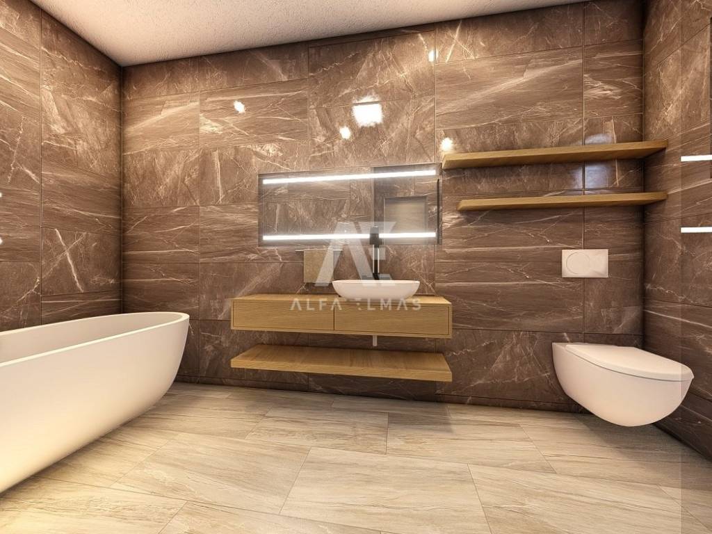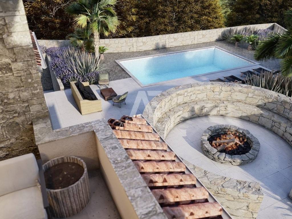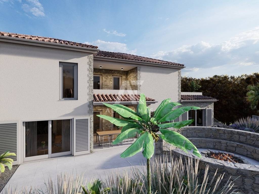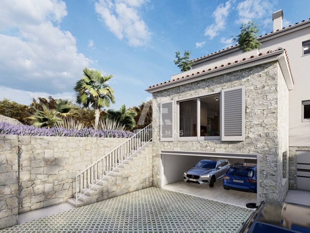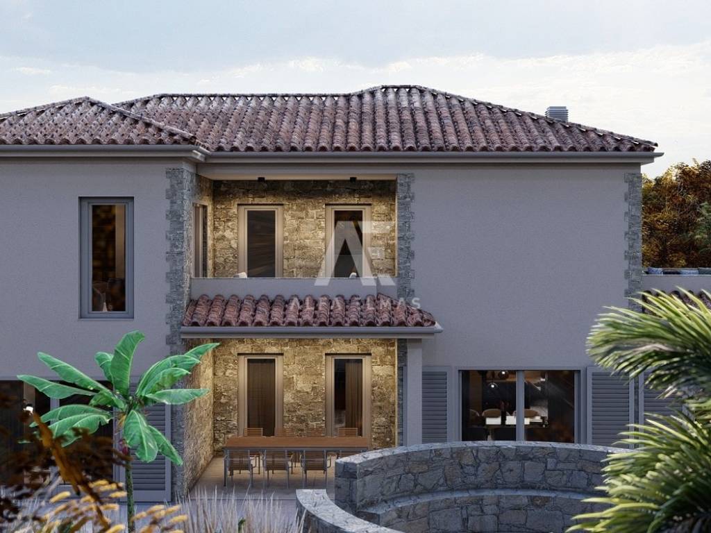 Dobrinj, surroundings, luxurious detached stone house under construction in a quiet location, only 2800m from the sea. The property consists of basement, ground floor and first floor, which extends to 360 m2 of living space, and is located on a plot of 741 m2. In the basement of the house there is a garage for two vehicles and internal stairs leading to the ground floor of the house. On the ground floor there is a spacious entrance hall, a guest toilet, a storage room, a master bedroom with its own bathroom, a kitchen, a dining room, and a spacious living room with a fireplace that make up the whole. From the living room there is an exit to the covered terrace, and to the spacious sunbathing area with a swimming pool and fireplace. An internal staircase leads to the first floor, where there are two comfortable bedrooms of larger square footage, each with its own bathroom and exit to the terrace with a view of the beautiful surroundings. The facility's equipment is top-notch, including central underfloor heating, air conditioning in all rooms, high-quality ceramics, ALU joinery, and the floors will be covered with high-quality wooden parquets and ceramics. The furniture includes bathroom furniture. There is a large fireplace with a barbecue in the garden. The environment itself will be beautifully landscaped and equipped with an irrigation system