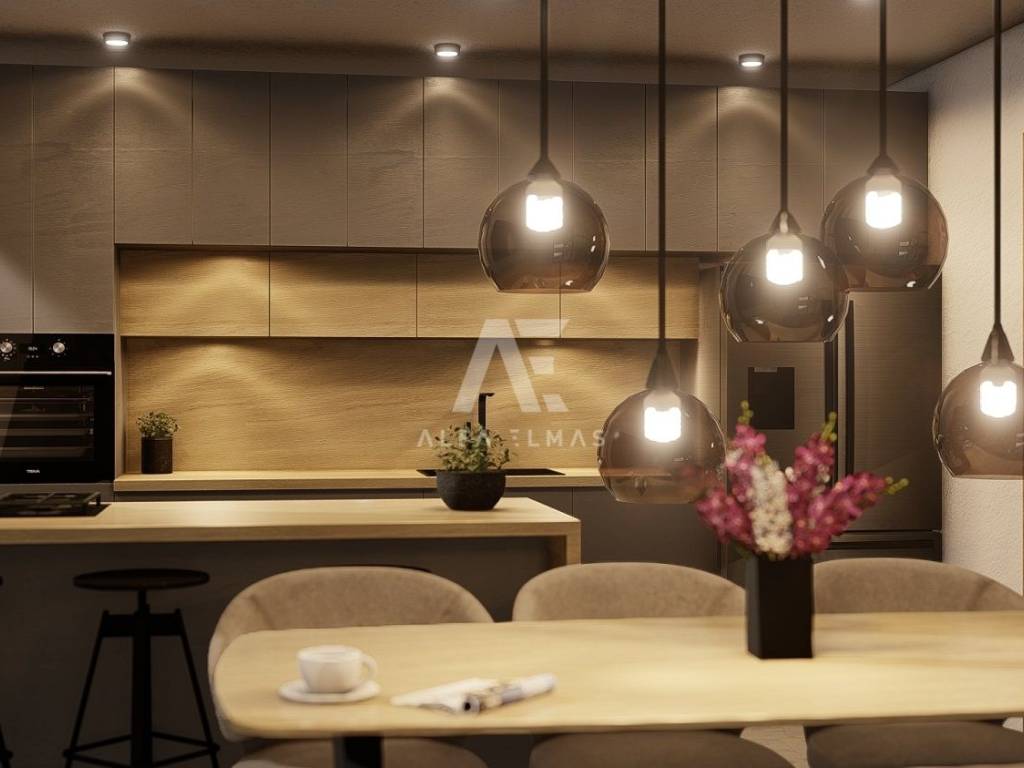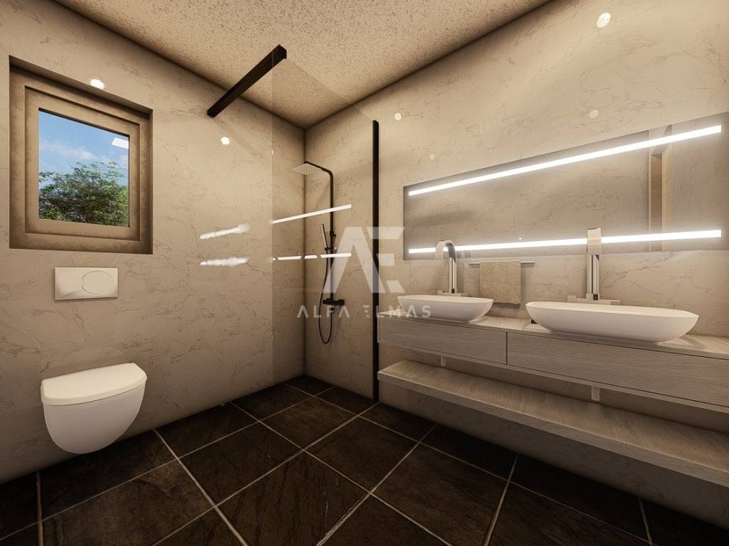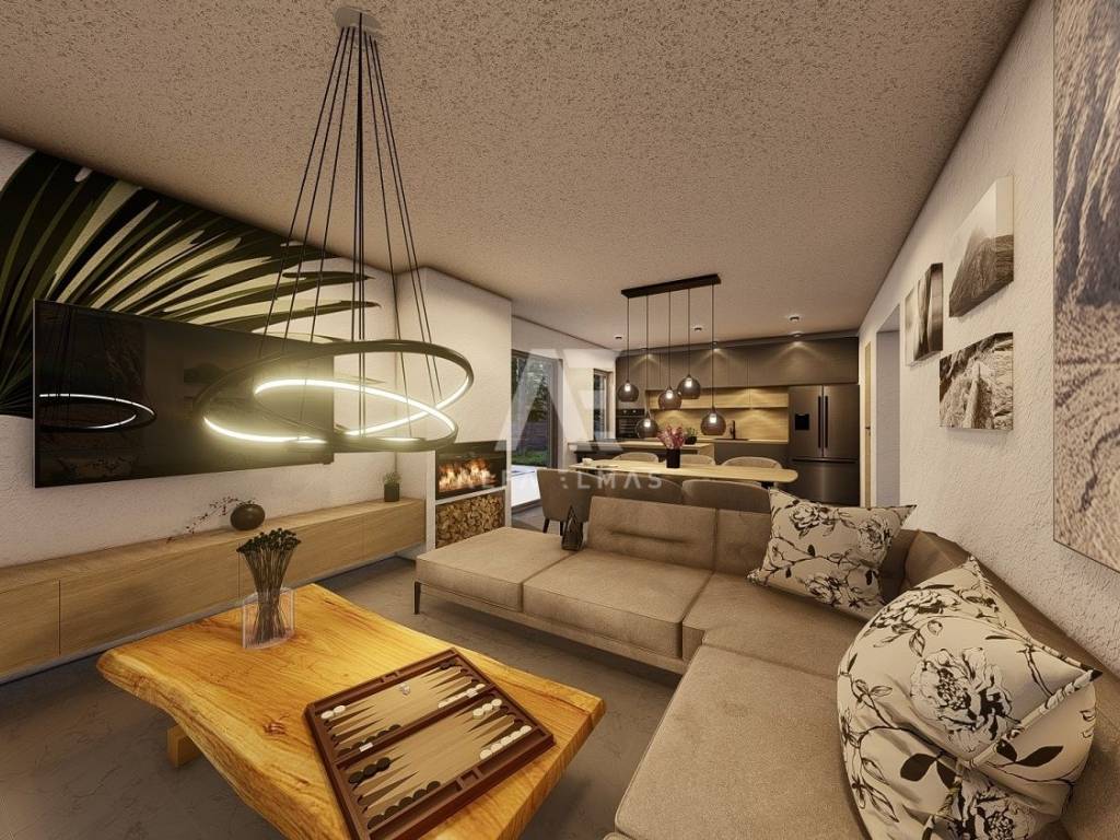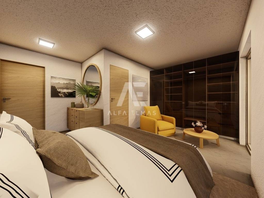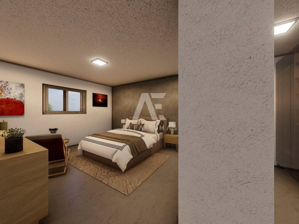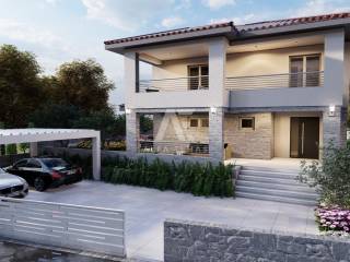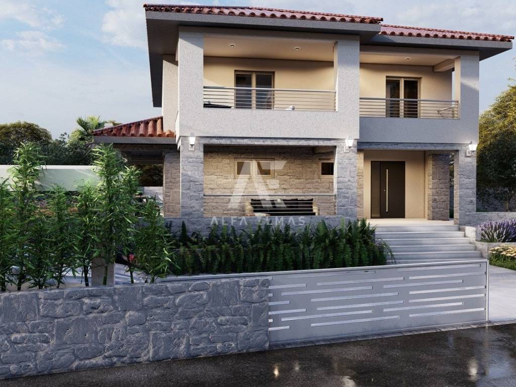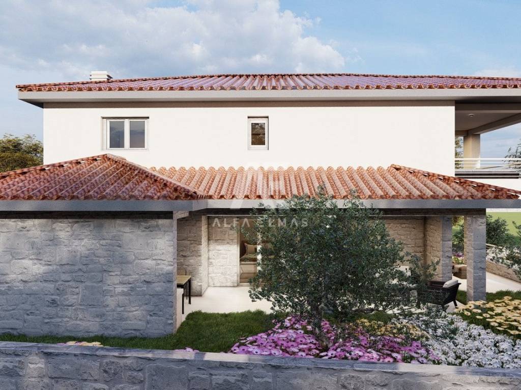 Dobrinj, surroundings, attractive detached new stone house with swimming pool. The house in the Mediterranean style has two floors, the ground floor and the first floor are located on a plot of 610 m2 and are currently under construction. The net residential area of 168 m2 allows for a functional layout and comfort. On the ground floor there is a kitchen and a dining room, a living room with access to two covered terraces of a total of 76m2 and an outdoor kitchen, a toilet, a storage room/laundry room and a bedroom with its own bathroom. The internal stairs lead to the first floor where there are three bedrooms, each with en suite bathroom and exit to a 24m2 balcony with sea view. The house has a landscaped garden of 430 m2, where there is a swimming pool of 32m2 (8mx4m) and a sunbathing area of 136m2, a garden with Mediterranean plants and an area for parking spaces of up to 98m2. High-quality construction, excellent equipment. The house will be equipped with PVC carpentry, top quality sanitary ware, SAT. The house is located only 2000m from the sea, restaurants, promenade and shops. Proper documentation