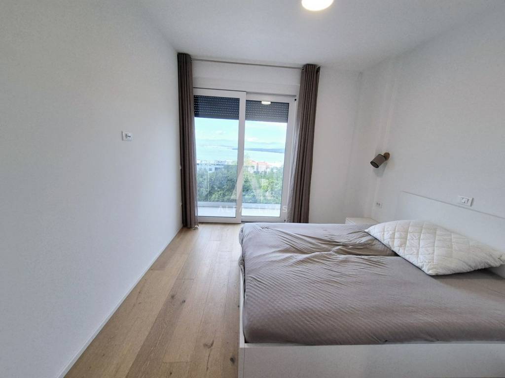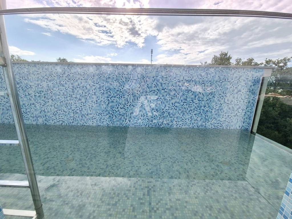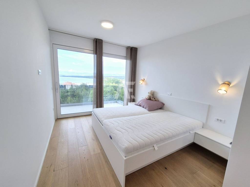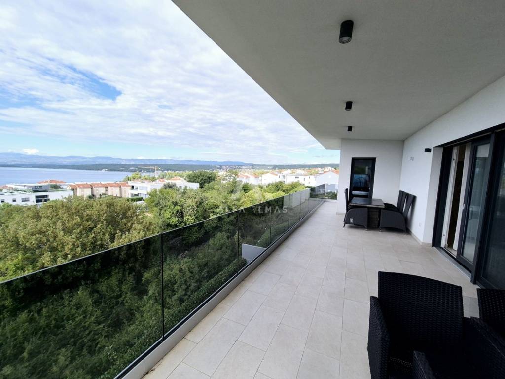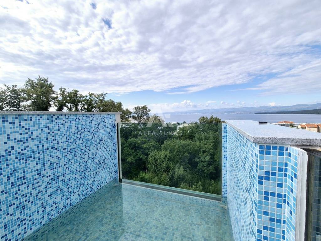 In a prestigious location in Malinska, just 400 meters from the sea, lies a modern penthouse that stands out for its functional layout and panoramic sea view. The apartment covers 192 m² and consists of a spacious living room with kitchen and dining area, three comfortable bedrooms with sea views, three bathrooms, and two storage rooms.