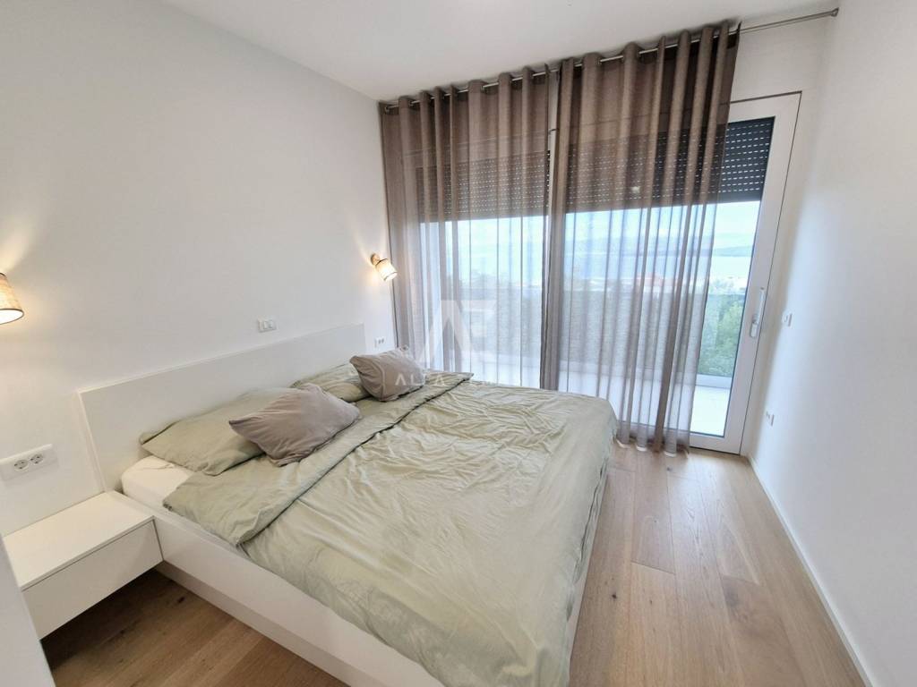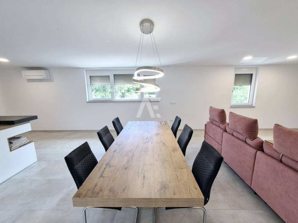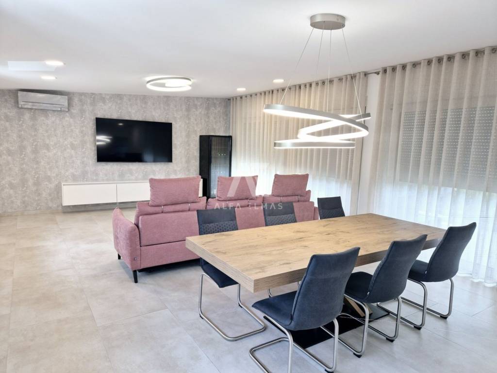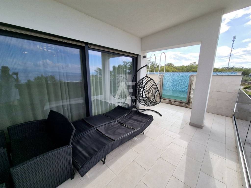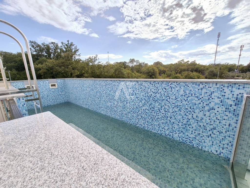 In a prestigious location in Malinska, just 400 meters from the sea, lies a modern penthouse that stands out for its functional layout and panoramic sea view. The apartment covers 192 m² and consists of a spacious living room with kitchen and dining area, three comfortable bedrooms with sea views, three bathrooms, and two storage rooms.
