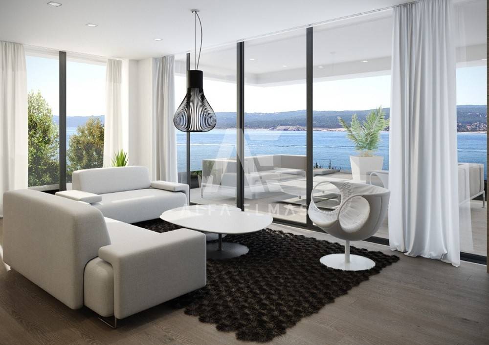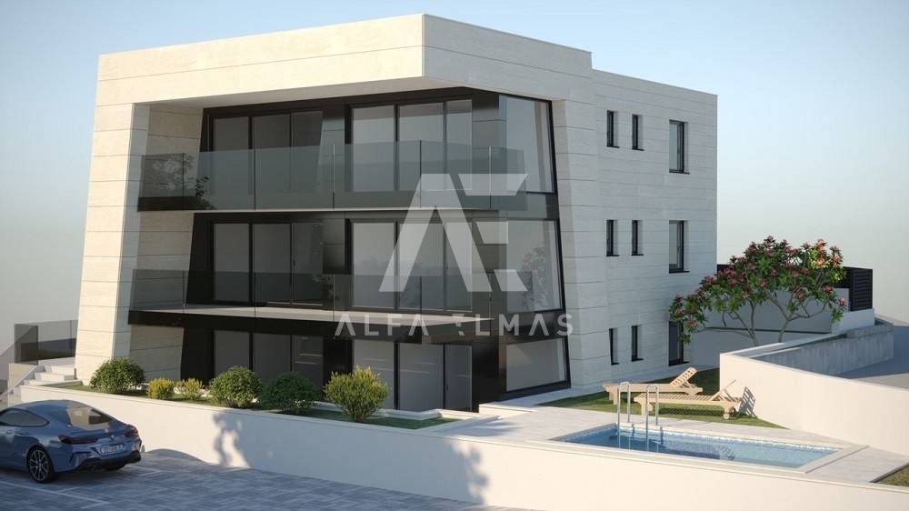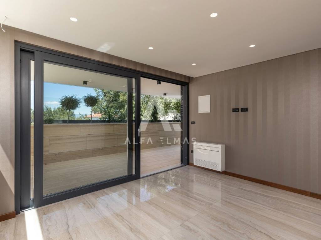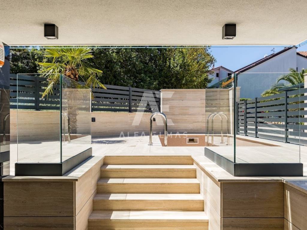 Malinska, new building, luxurious modern apartment of 113m2 with garden and swimming pool on the ground floor of a residential villa with three residential units. The luxurious apartment with a comfortable layout consists of a combined living room, kitchen, dining room with large panoramic glass walls and access to a covered terrace with a swimming pool and sunbathing area, bathroom, toilet and three bedrooms, one of which has its own bathroom. The equipment of the apartment on the ground floor includes high-quality ceramics, high-quality sanitary ware, parquet, underfloor heating, air conditioning system in all rooms, and carefully selected lighting fixtures that give the apartment a pleasant impression that you will enjoy!! On a landscaped garden of 126m2. it includes a swimming pool with a sunbathing area and a built-in parking lot of 24 m2. for two vehicles. The luxury apartment is located in an exclusive location in Malinska, only 80m from the sea, promenade, beach!!