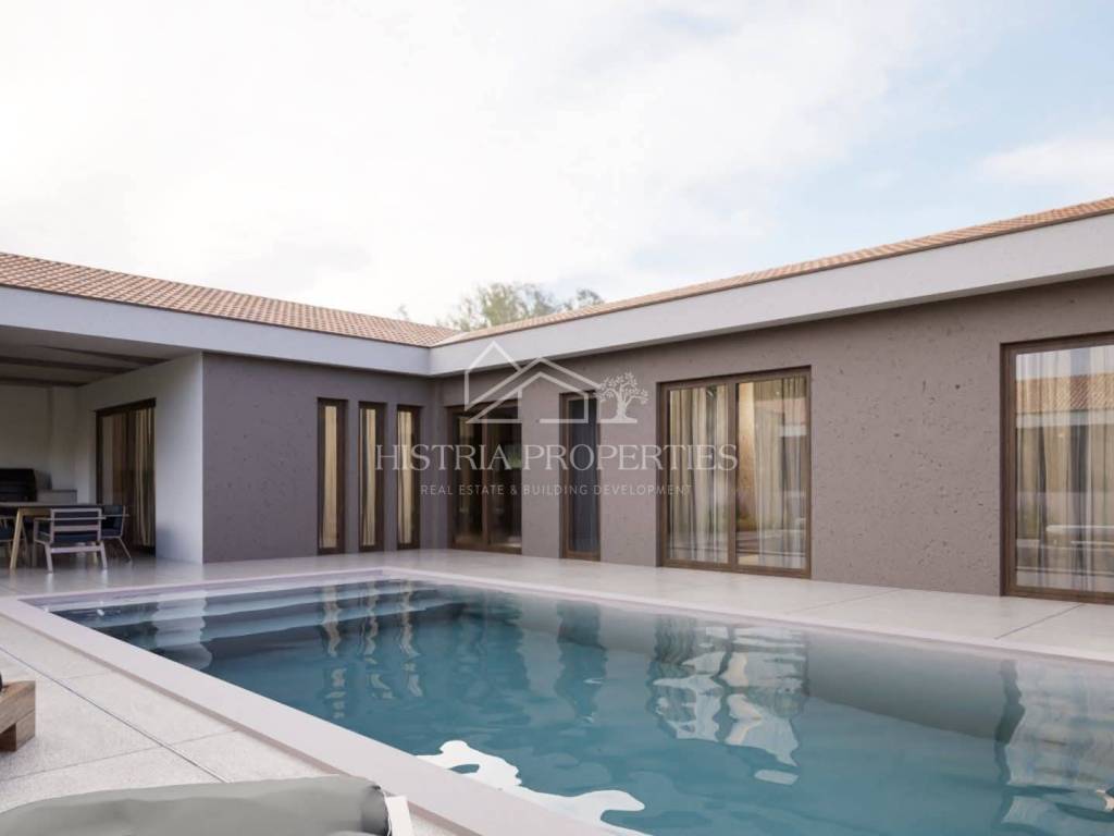 In a quiet location along a local road, this modern single-storey house with a swimming pool and a useful outbuilding is located, complete with rustic details and part of the facade made of natural stone.