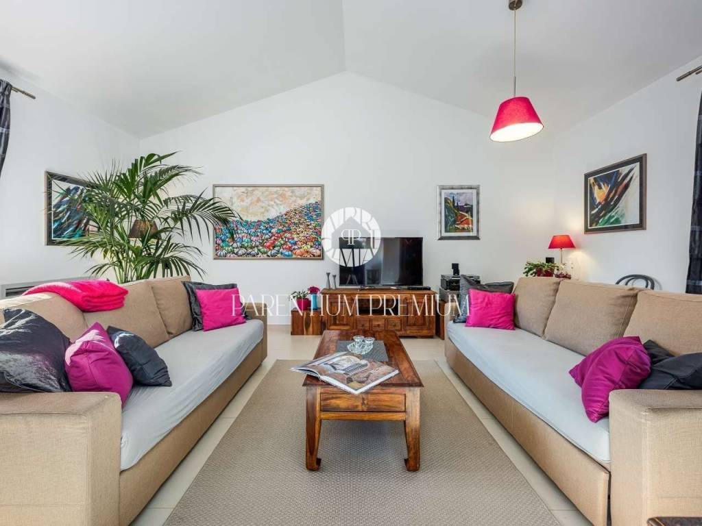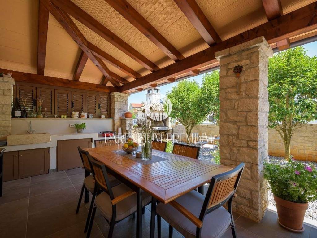 Istria, PorečAn elegant detached villa for sale on a 565 m² plot, just a ten-minute drive from the sea and the city center.The house is built on a 565 m² plot, the living area is 140 m², while the total gross area with the basement and terraces reaches 208 m².This modernly equipped home combines a quiet private location with top-notch comfort and energy efficiency.A spacious open-concept living room connected to the kitchen and dining room makes the ground floor perfect for family gatherings, while the first floor features two comfortable bedrooms, a dressing room and a large terrace overlooking the landscaped yard. An additional 20 m² of basement offers flexible space for a hobby, gym or storage.The house was built with an emphasis on sustainability: underfloor heating with a heat pump, a fan-coil system in all rooms, solar panels and its own solar power plant ensure high energy independence and low utility costs.The courtyard features a swimming pool with an ecological filtration system, a covered summer kitchen and a fireplace – ideal for relaxing and enjoying warm days.This property offers the perfect balance of privacy, modern design and proximity to city amenities, making it an excellent opportunity for residential or tourist investment.For additional information or a viewing, we are happy to assist you.