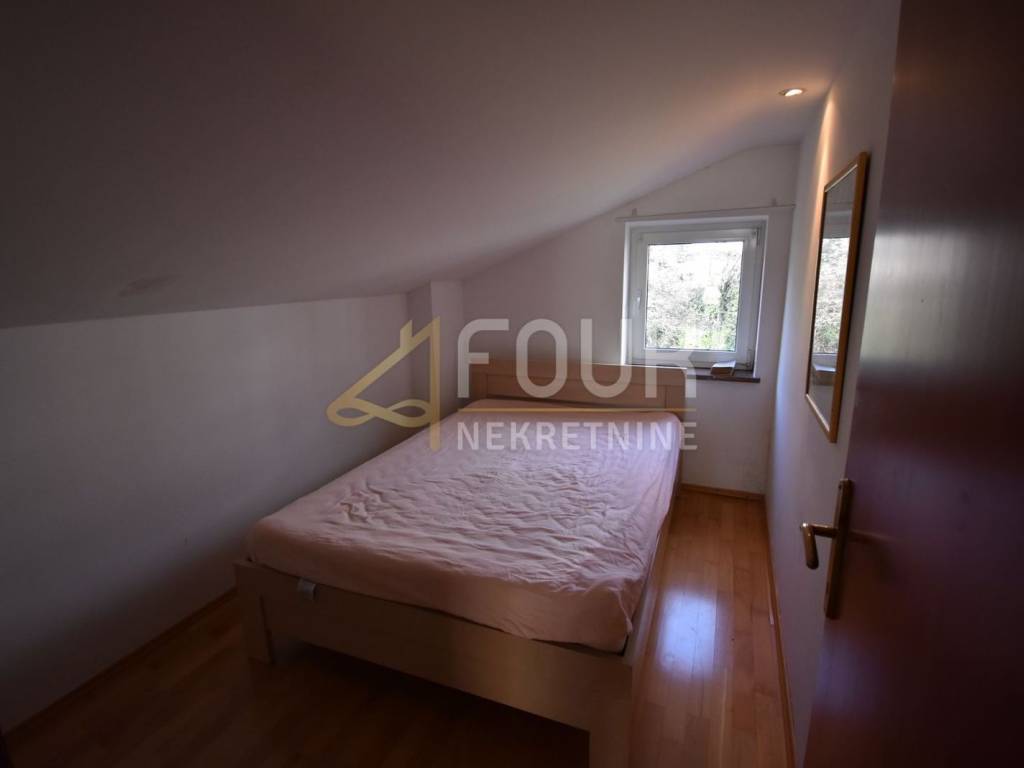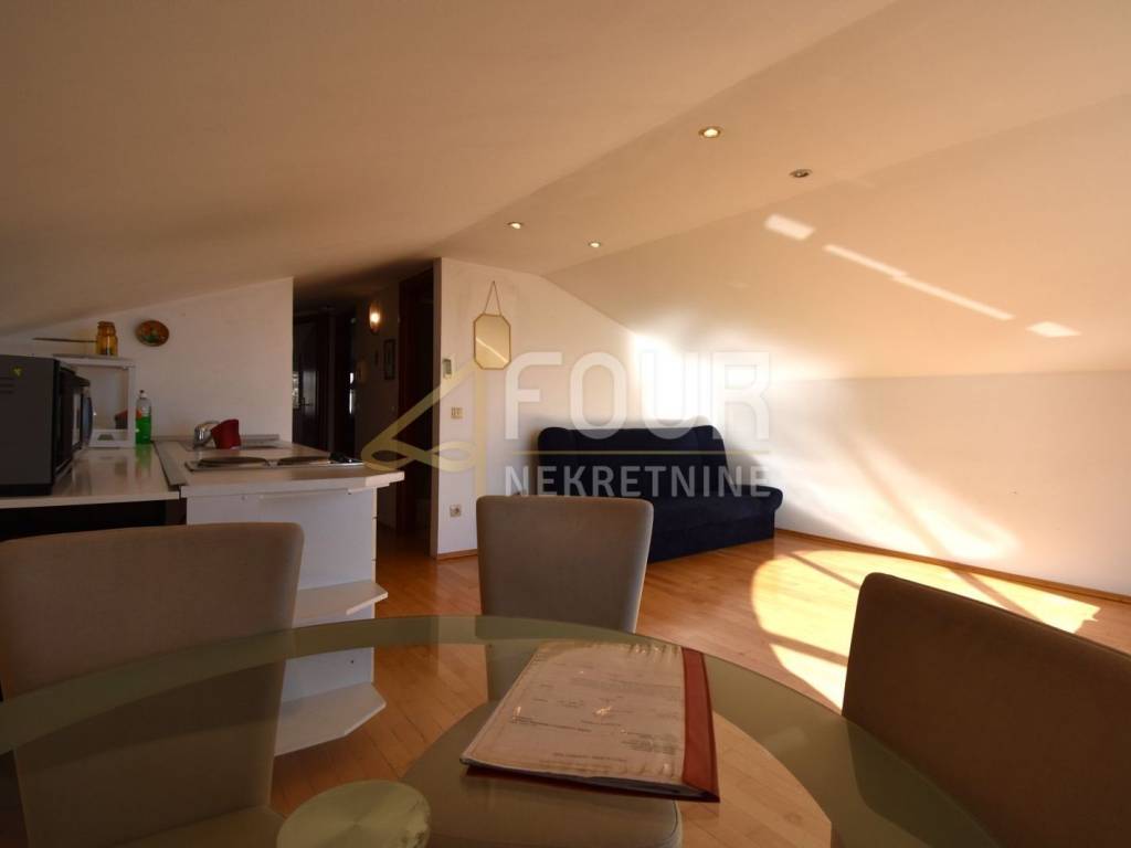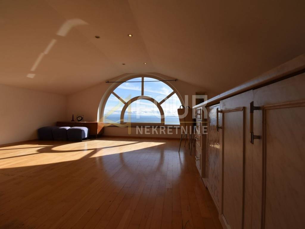 An apartment with a beautiful sea view is for sale in Volosko, located in a small gated residential building. This is a high attic apartment, oriented to the north and south, ensuring good lighting and pleasant airflow. The total living area is 57.94 m2, and the apartment consists of an entrance hall, one bedroom, a bathroom, and a living room with a kitchen and dining area that offers an open view of the sea. The apartment also includes an entrance staircase with a platform, additional area of 5.31 m2. The property is in its original condition, neat and ready to move in, but refreshing the space could further emphasize its full potential. It is sold furnished, equipped with PVC joinery and air conditioning.