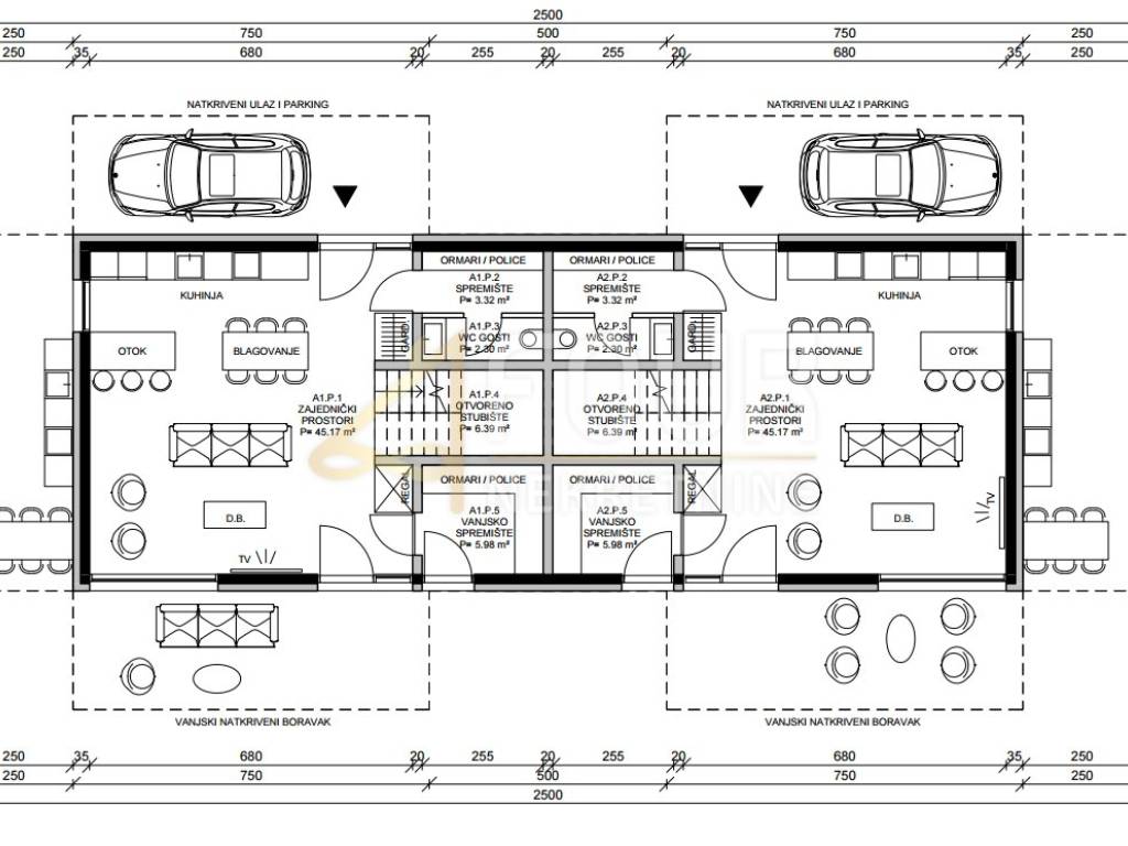 The ground floor features an entrance wardrobe, a spacious open-plan living area (kitchen, dining room, and living room) of 45.17 m², a pantry (3.32 m²), guest toilet (2.30 m²), internal staircase (6.39 m²), and an additional storage space for tools and equipment (5.98 m²) with direct access from the garden.