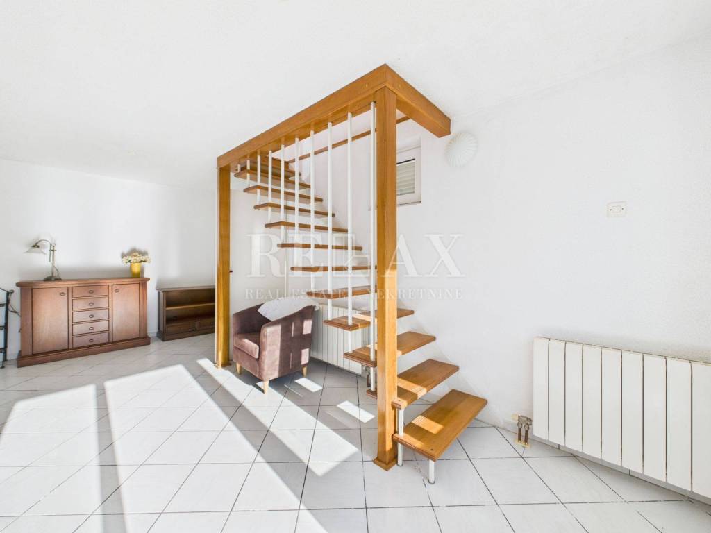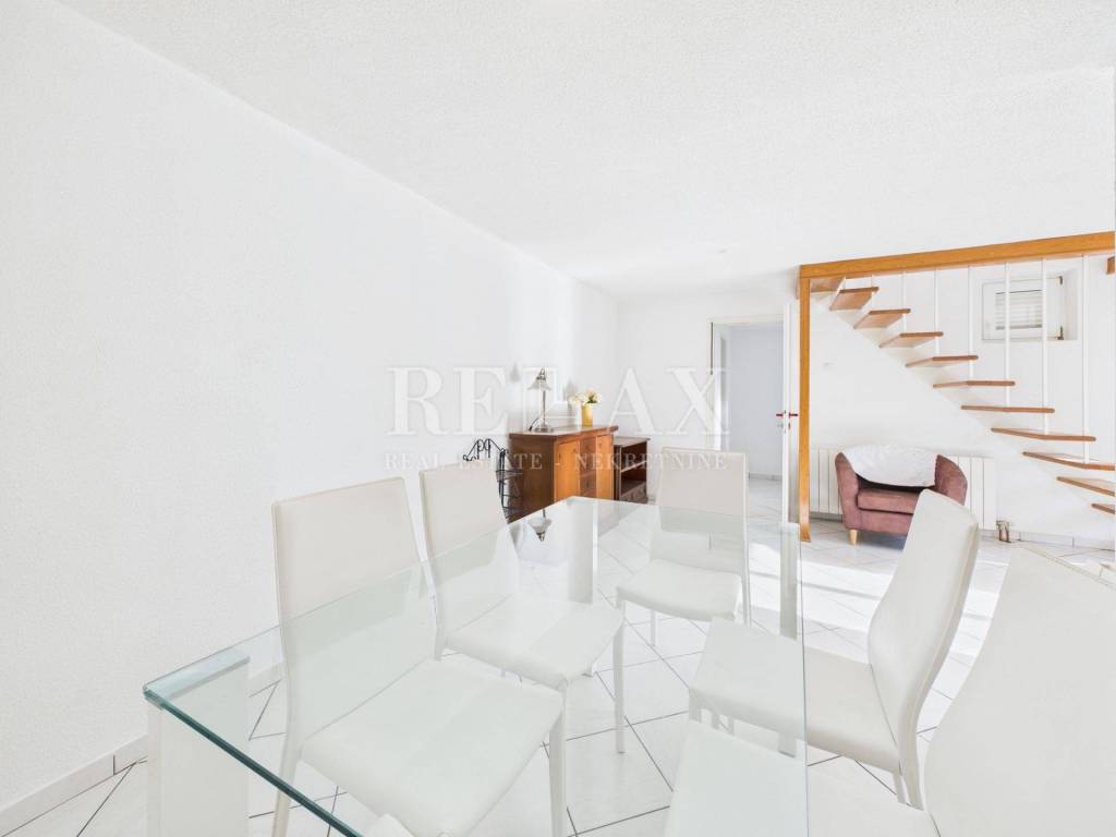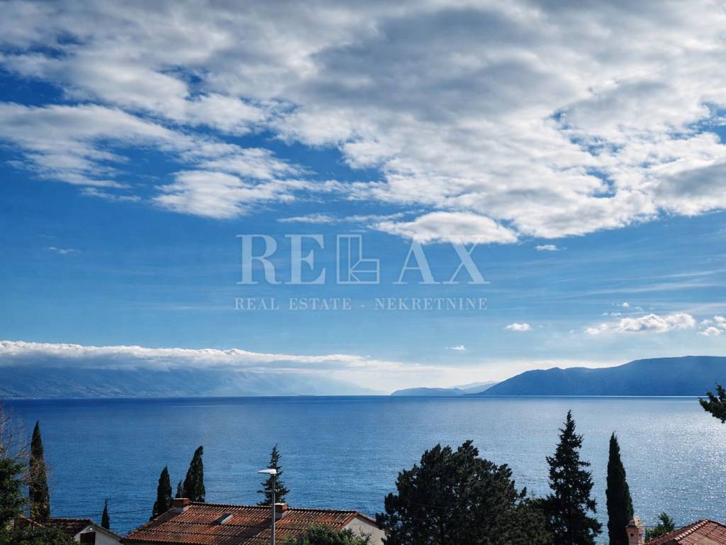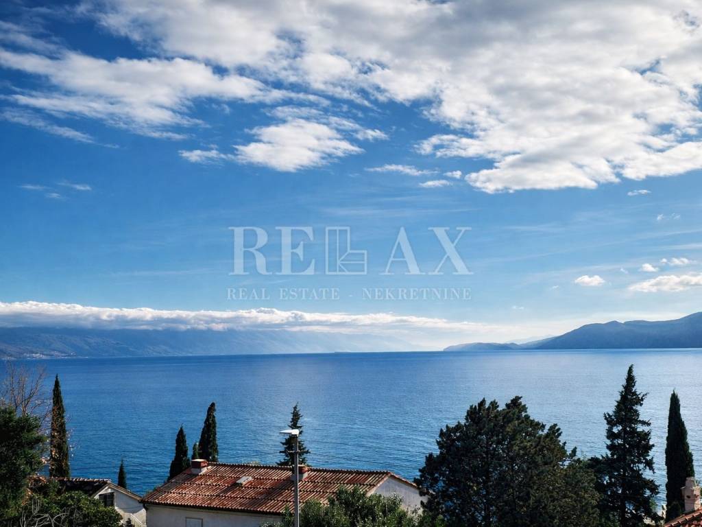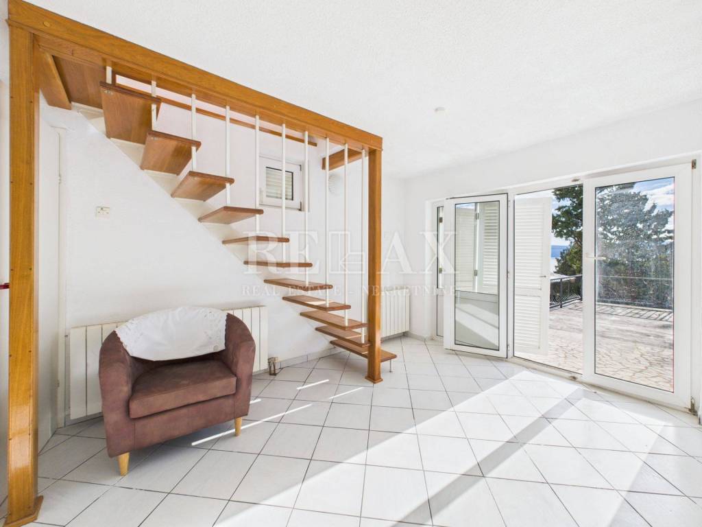 On the ground floor, there is a kitchen with a dining area that opens onto a terrace, a bathroom, and access to the garden. The upper floor features a living room with access to a balcony offering a captivating view of the Kvarner Bay, two bedrooms, and an additional bathroom. Wooden stairs, bright flooring, and large glass walls provide the space with airiness and natural light.