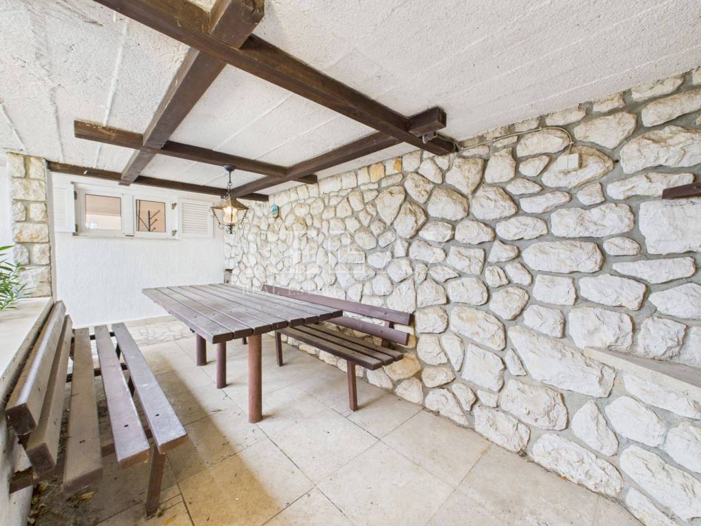 Behind the house is a well-maintained area with a summer kitchen and a covered outdoor seating area – perfect for spending time outside for most of the year. The house includes a garage equipped with water and electricity installations, as well as an additional outdoor parking space in front of the garage – a significant advantage in this seaside zone.