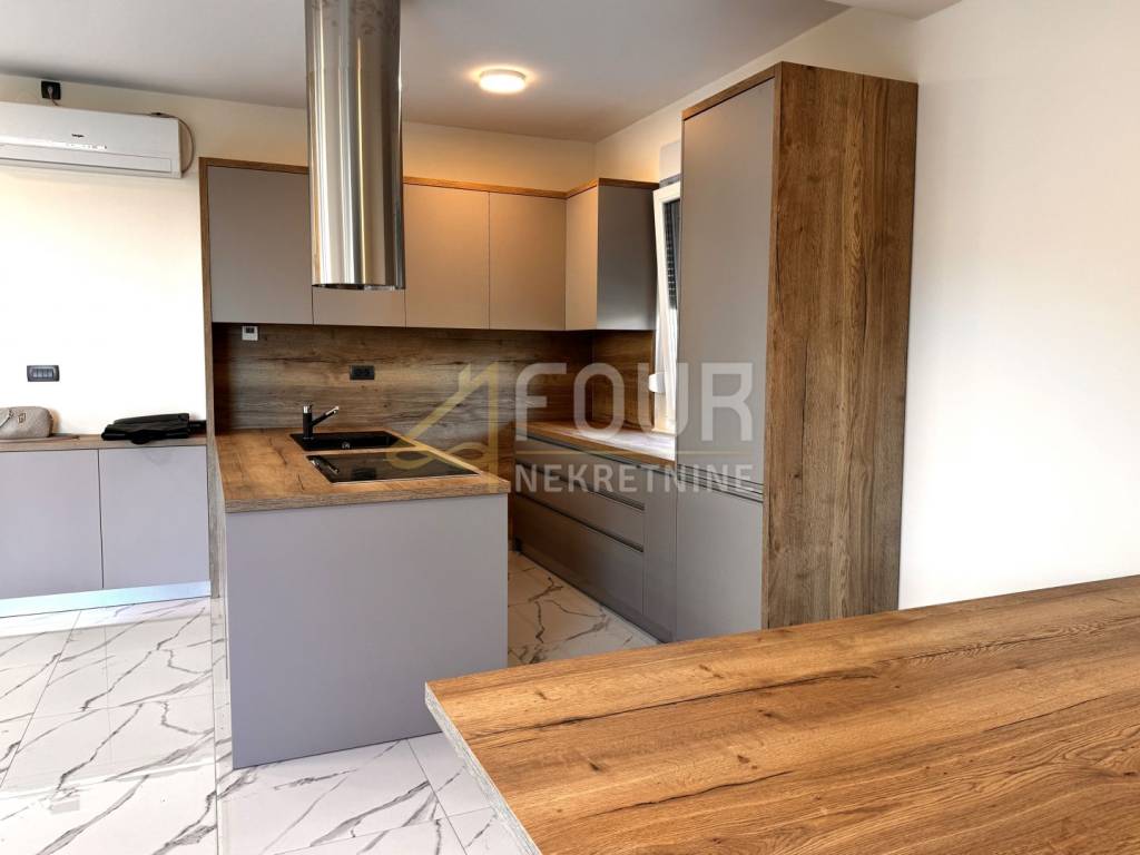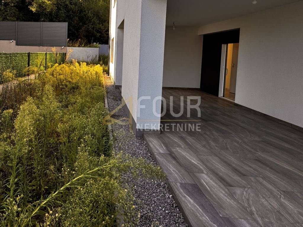 In Pobrima, Opatija, a luxury apartment in a newly built complex is for sale, with a living area of 102.61 m², located on the ground floor of a two-story building. It consists of an entrance and a spacious hallway leading to an open-plan living room with kitchen and dining area, connected to a covered and open terrace that surrounds the apartment and offers a sea view. The two large bedrooms feature built-in wardrobes from floor to ceiling, and there are two fully equipped bathrooms.