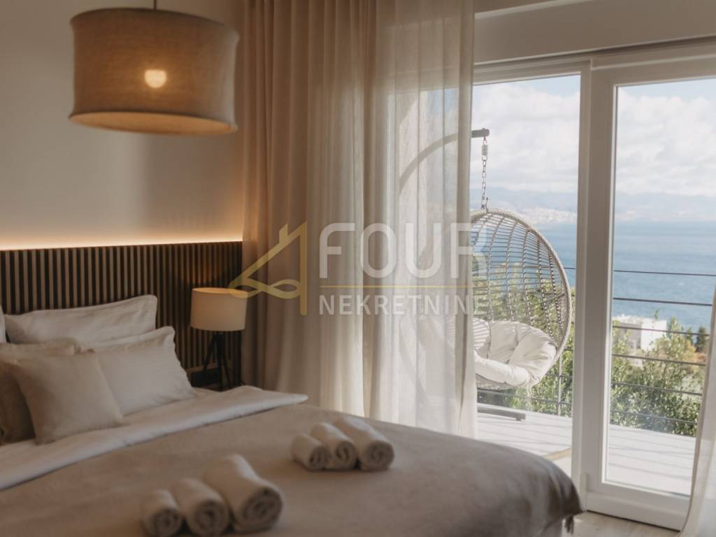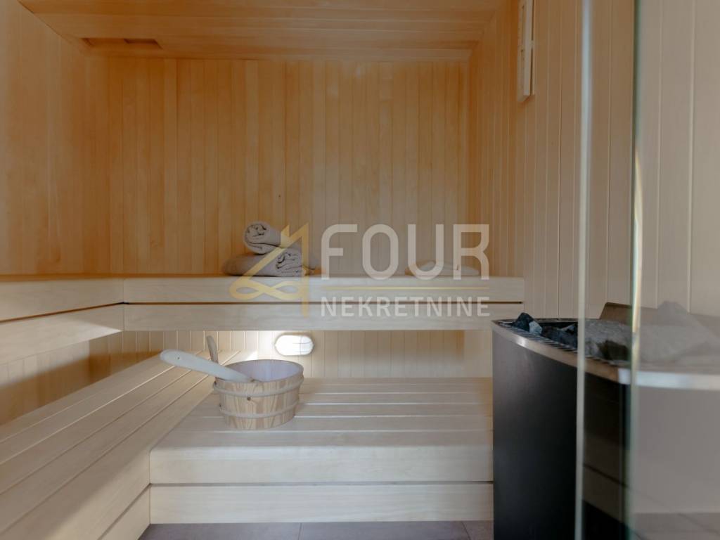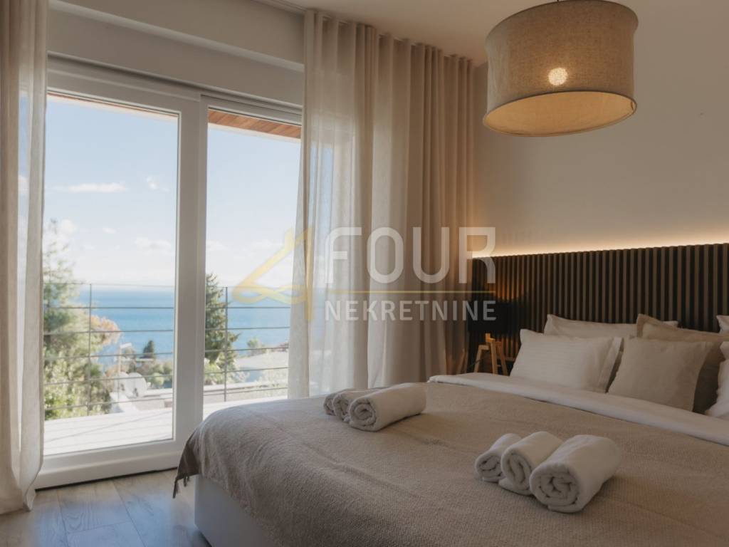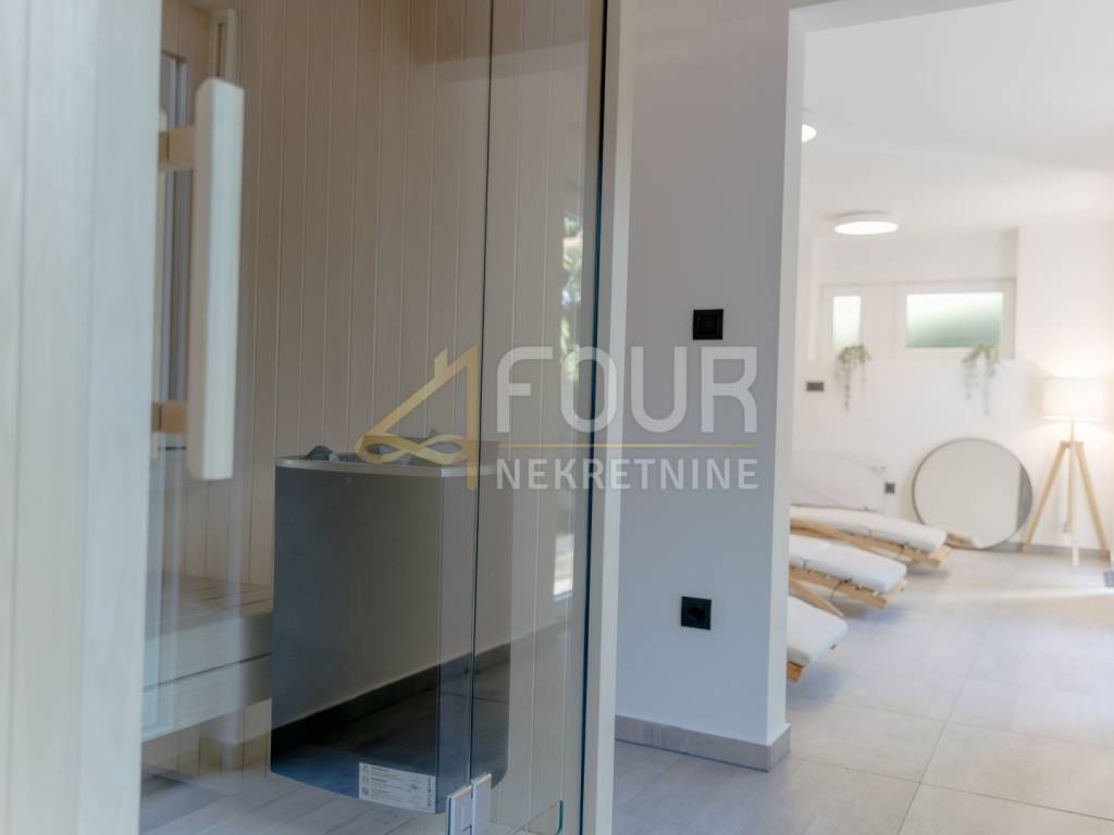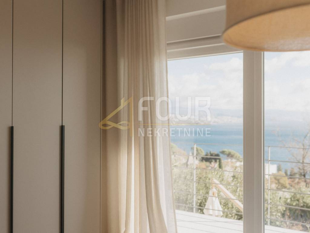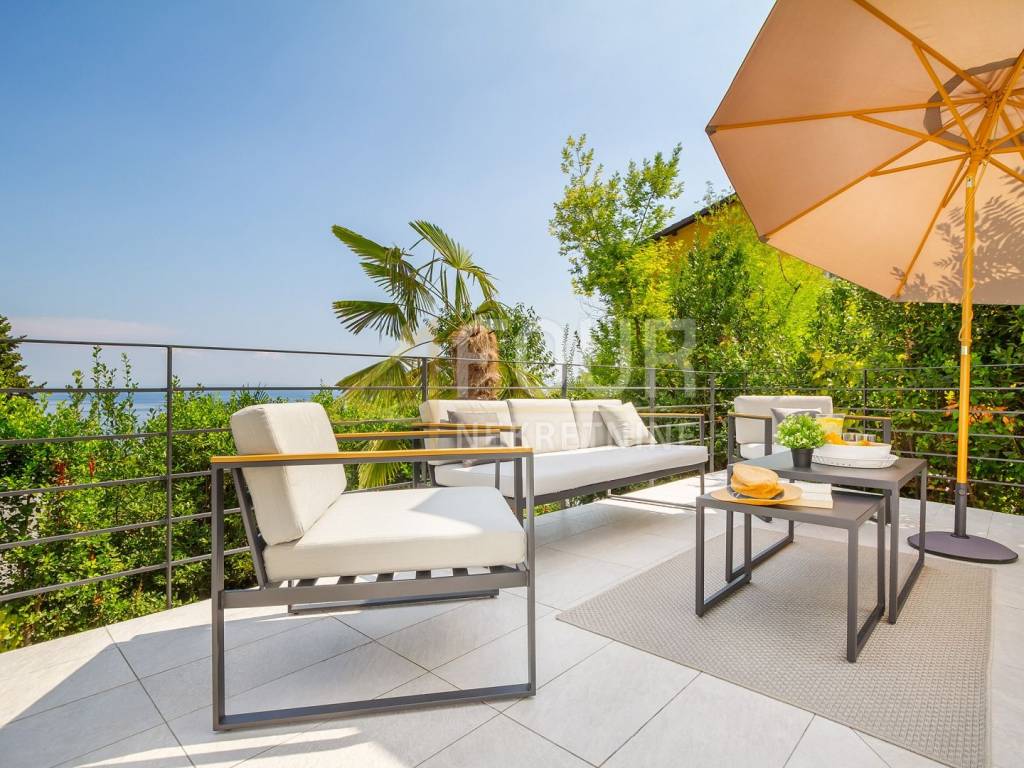 A beautiful detached house is for sale in Opatija, located in a quiet dead-end street with a stunning sea view. On a plot of 575 m², there is a modernly designed villa with a total living area of 242 m², surrounded by a landscaped garden, with spacious terraces offering a summer kitchen, sunbathing area, and relaxation spaces. Special comfort is provided by a heated pool, sauna, and additional areas for rest and socializing.