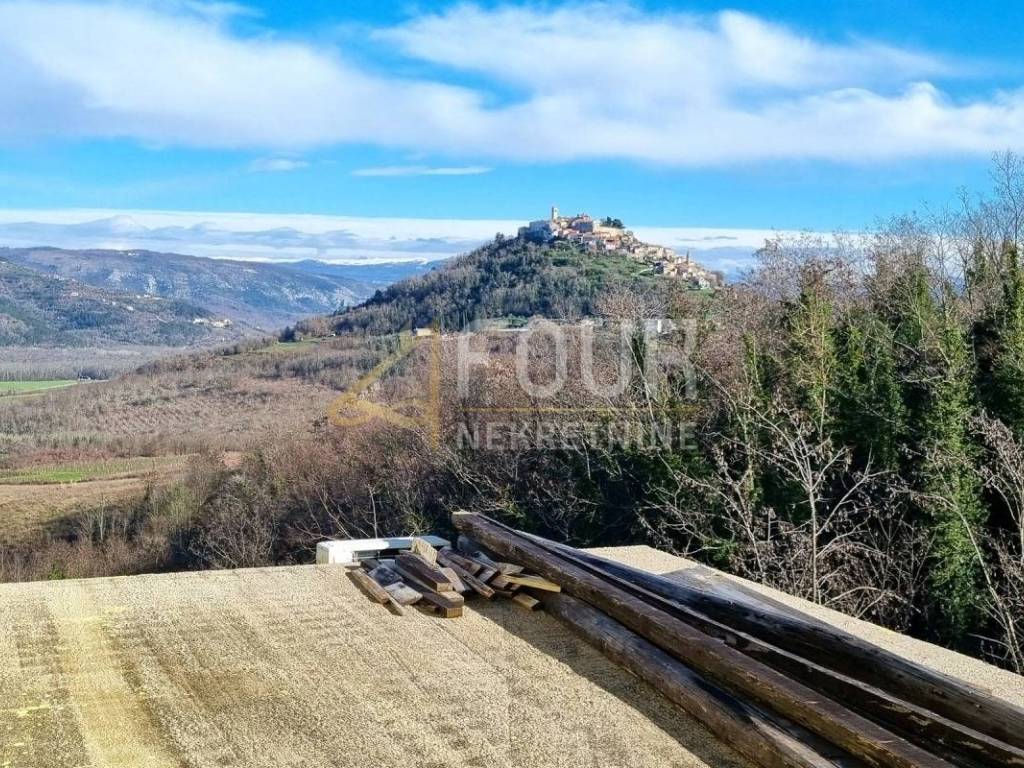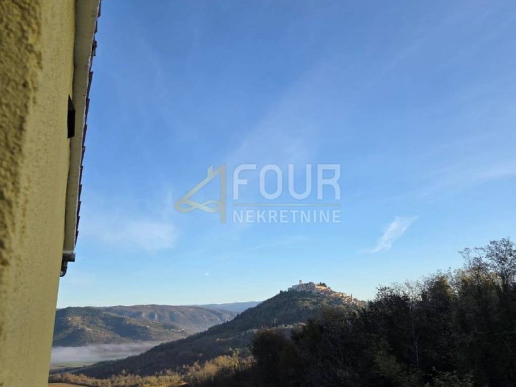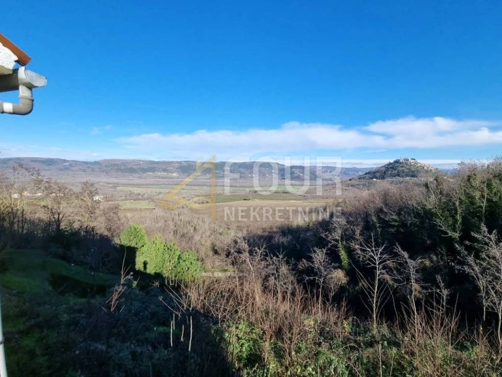 In a peaceful environment with a beautiful view of Motovun, a spacious semi-detached house with a large garden is for sale. Built in 1930 and renovated in the 80s, with a combination of brick construction and wooden mezzanine elements, it offers comfortable living space and additional valorization. The ground floor includes a basement with a fireplace and a garage, while the main part of the house is accessed by external stairs, where there are a kitchen, living room, three bedrooms, and a bathroom. A special room is located in the attic gallery, providing additional functionality and space. It is equipped with air conditioning, a fireplace, and wooden joinery, and has three parking spaces and a garage. It offers a great opportunity for own adaptation and decoration according to personal preferences. The large plot around the house ensures privacy and space to enjoy nature. An ideal property for those seeking a peaceful location with a view of Motovun, with potential for adaptation or tourist purposes. Dear clients, agency commission is charged in accordance with General Terms and Conditions.