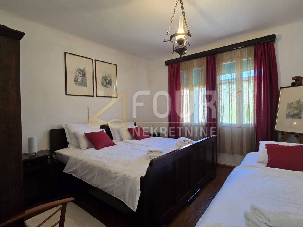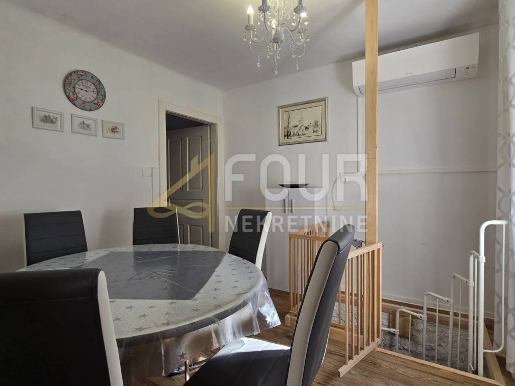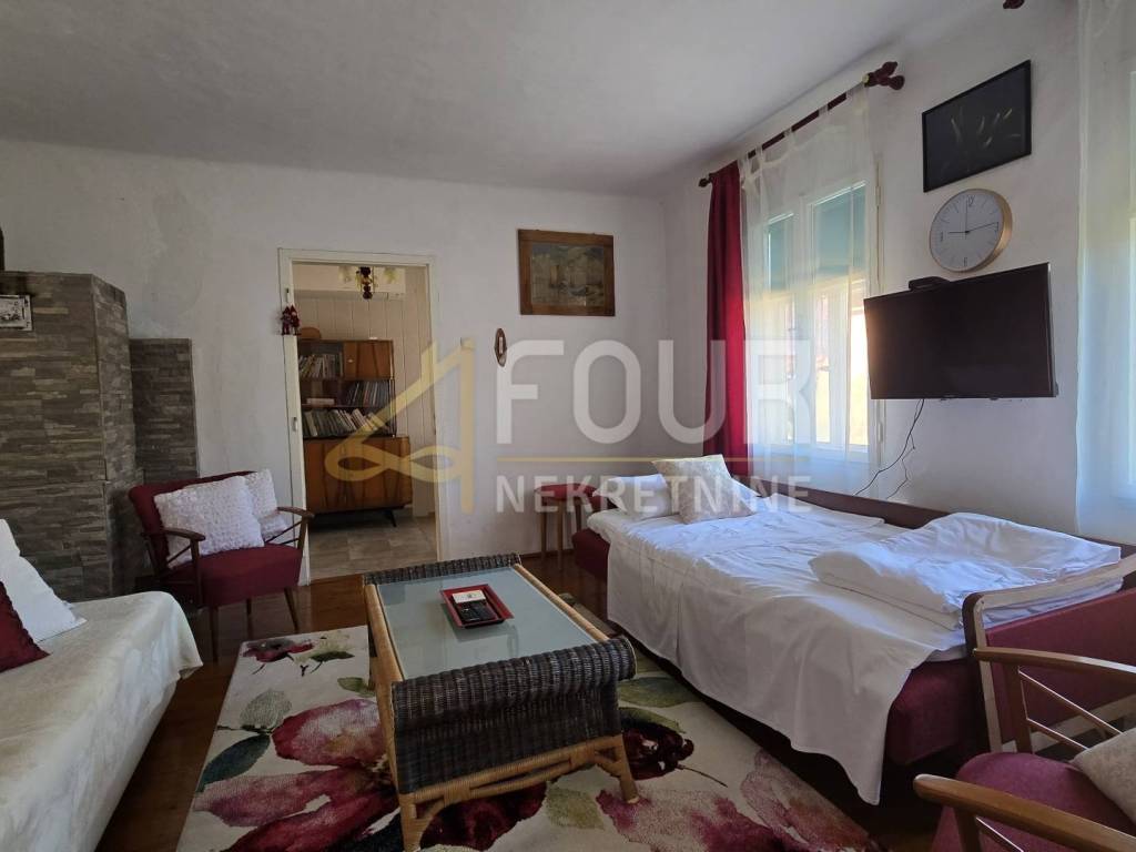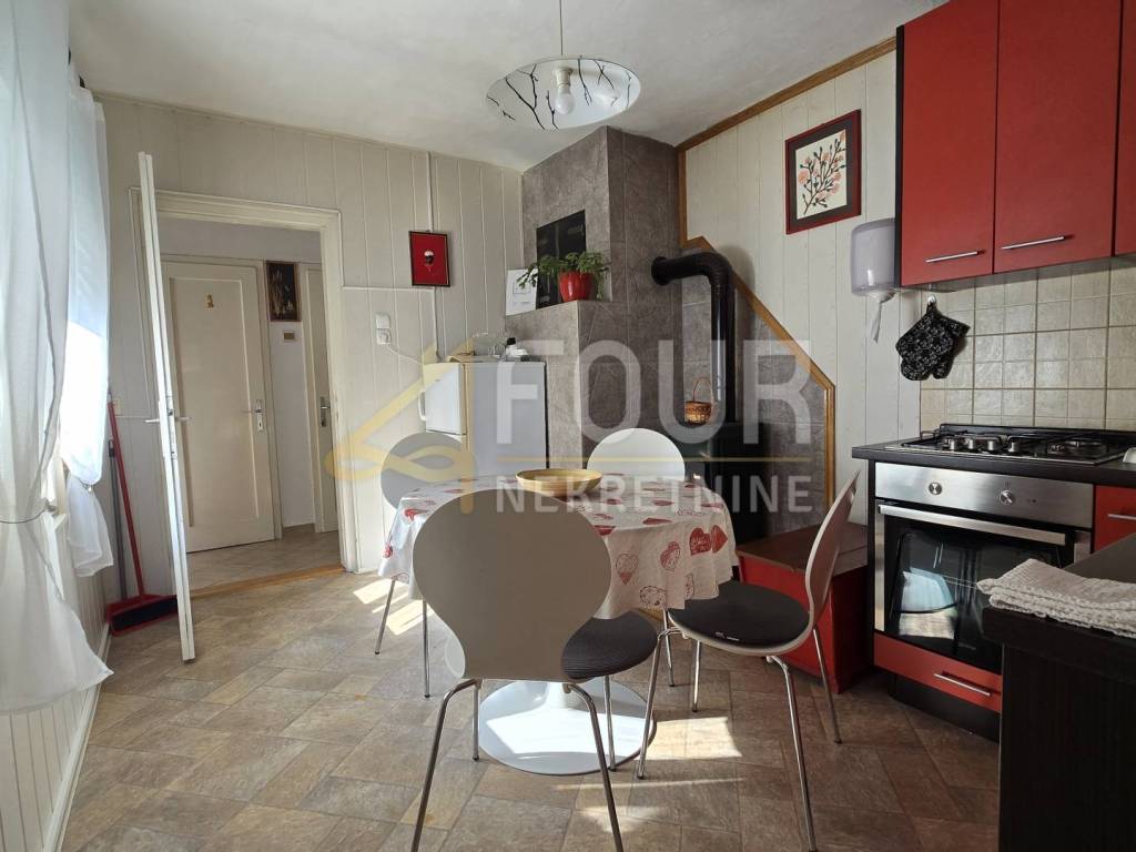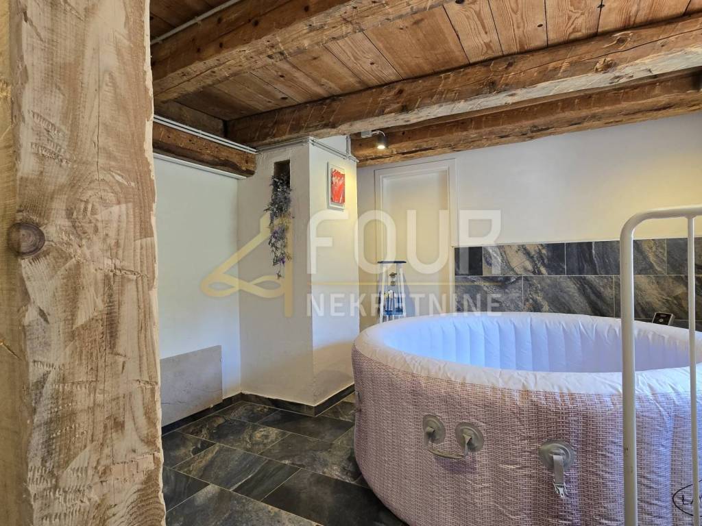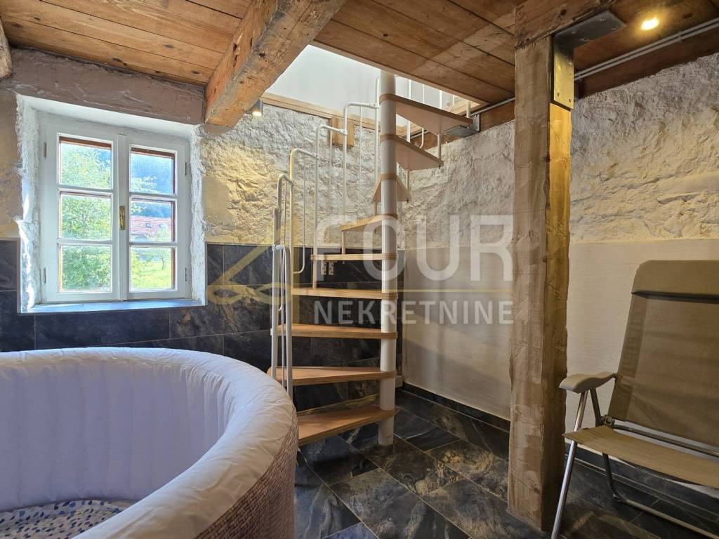 A detached house is for sale in Delnice, with a total area of 104 m², situated in a quiet location and categorized as a holiday home. It consists of a small entrance hall, kitchen, bathroom and separate toilet, two bedrooms, a study, and a living room from which stairs lead down to a space with a jacuzzi. Heating is provided by a wood-burning stove and air conditioning, while the wooden joinery and beams are in good condition.