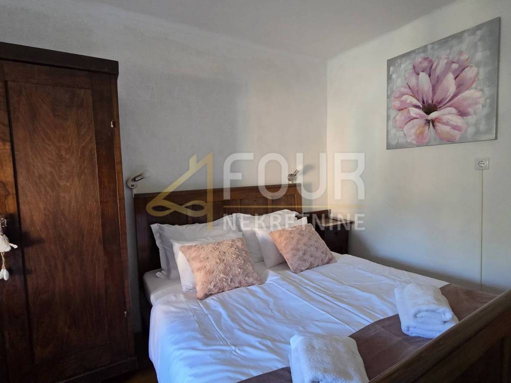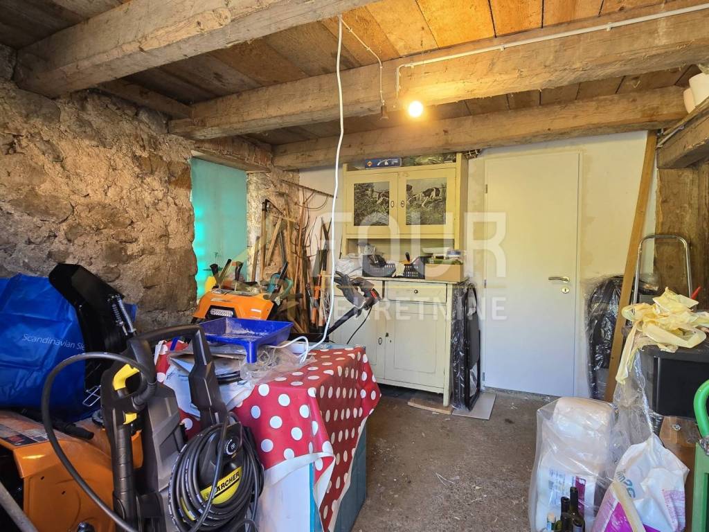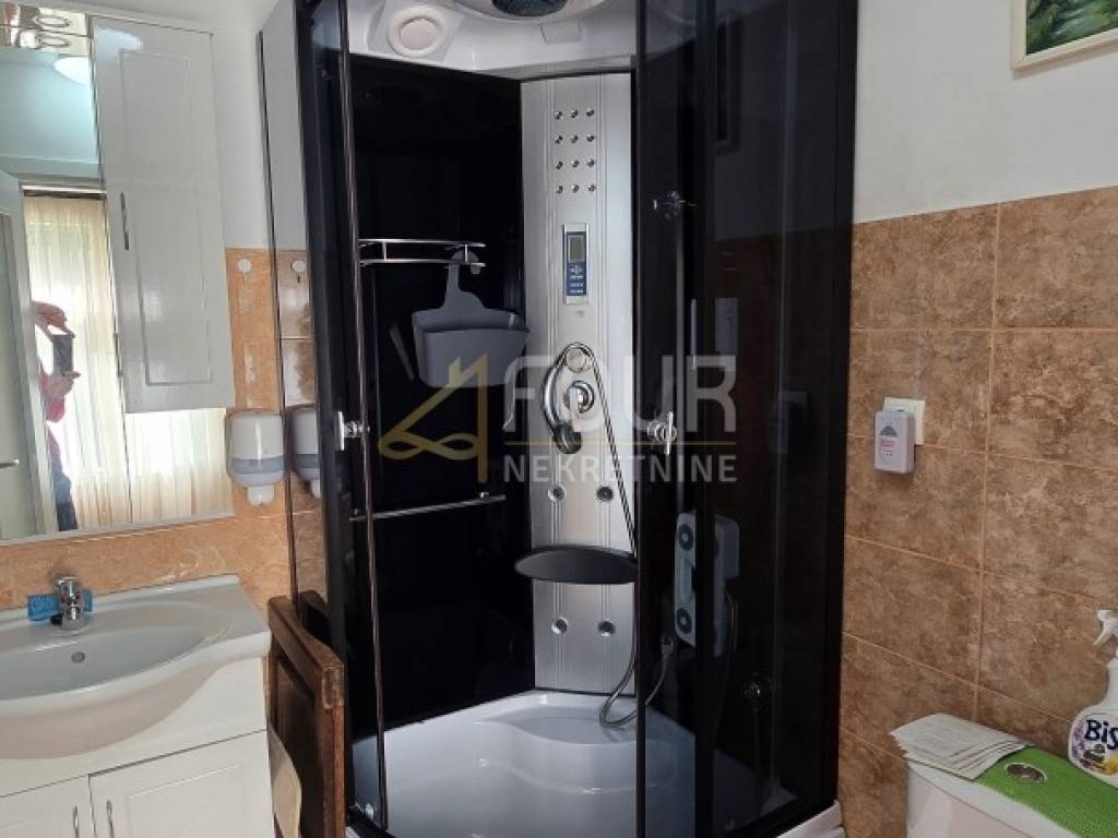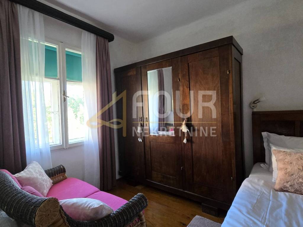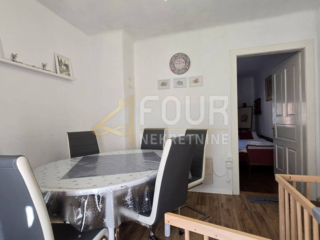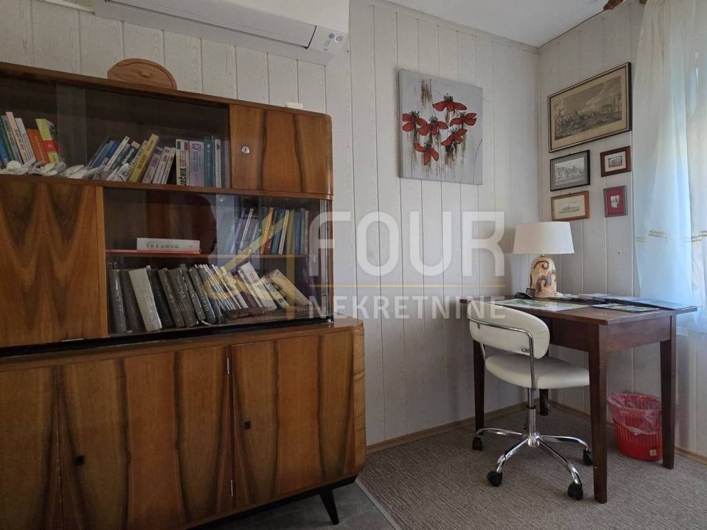 A detached house is for sale in Delnice, with a total area of 104 m², situated in a quiet location and categorized as a holiday home. It consists of a small entrance hall, kitchen, bathroom and separate toilet, two bedrooms, a study, and a living room from which stairs lead down to a space with a jacuzzi. Heating is provided by a wood-burning stove and air conditioning, while the wooden joinery and beams are in good condition.