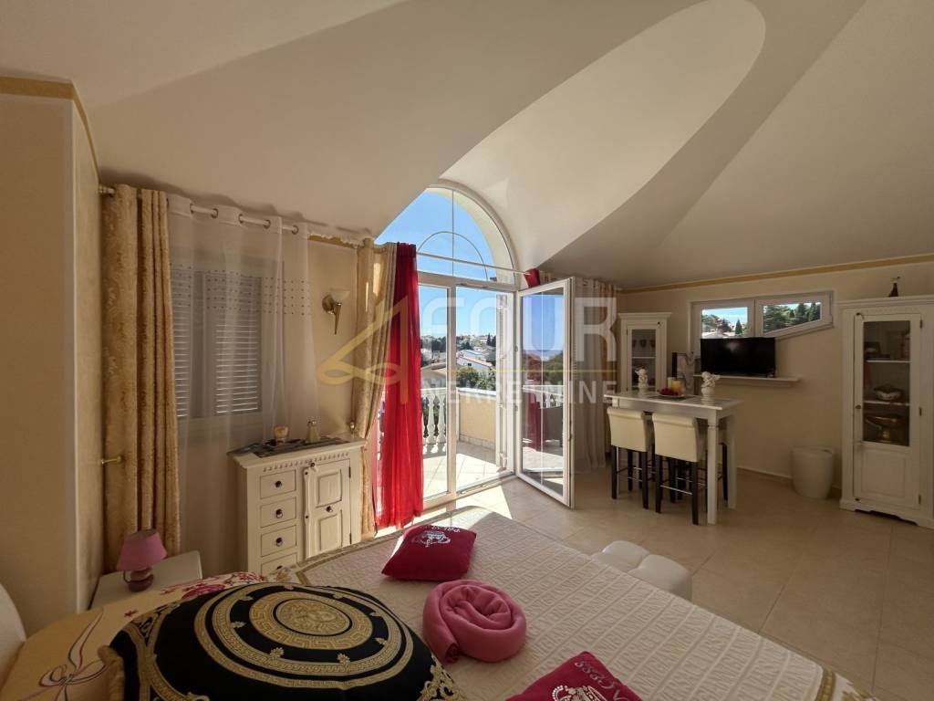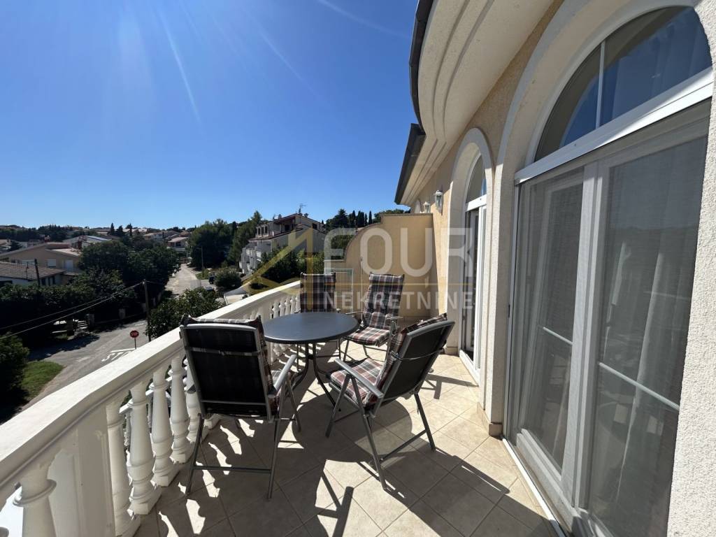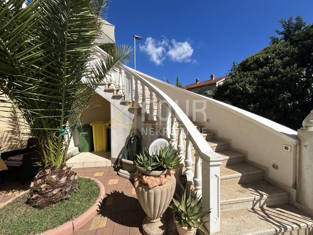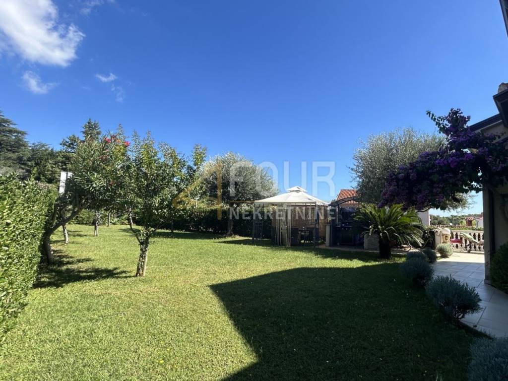 In Premantura, just 400 meters from the sea, a spacious detached house with four apartments, a swimming pool, a large garage, and a landscaped garden is for sale. The house extends over three floors with a total living area of 414 m², situated on a plot of 784 m², and offers stunning sea views from every level.