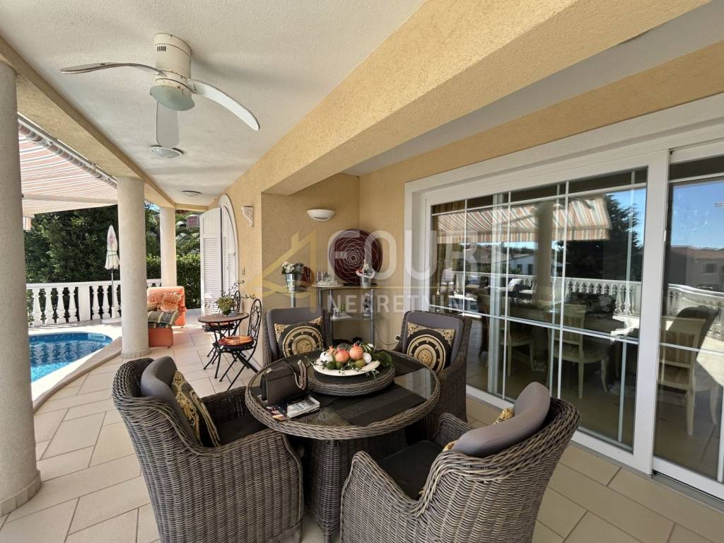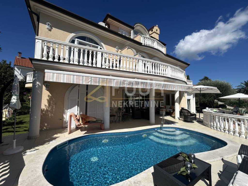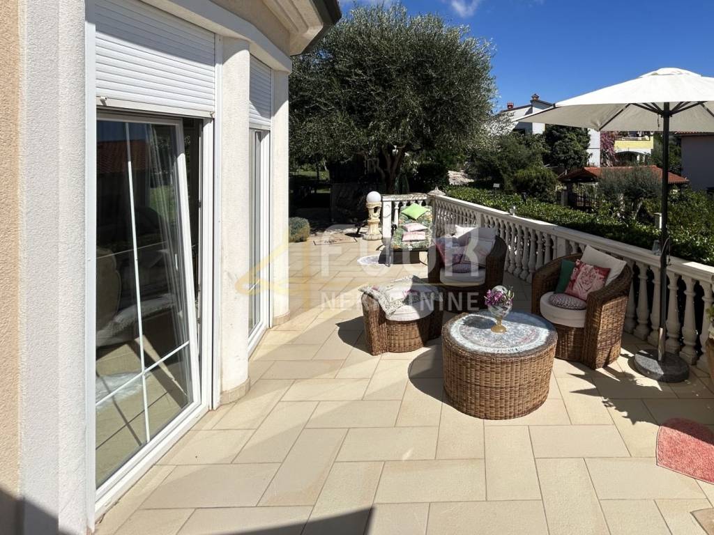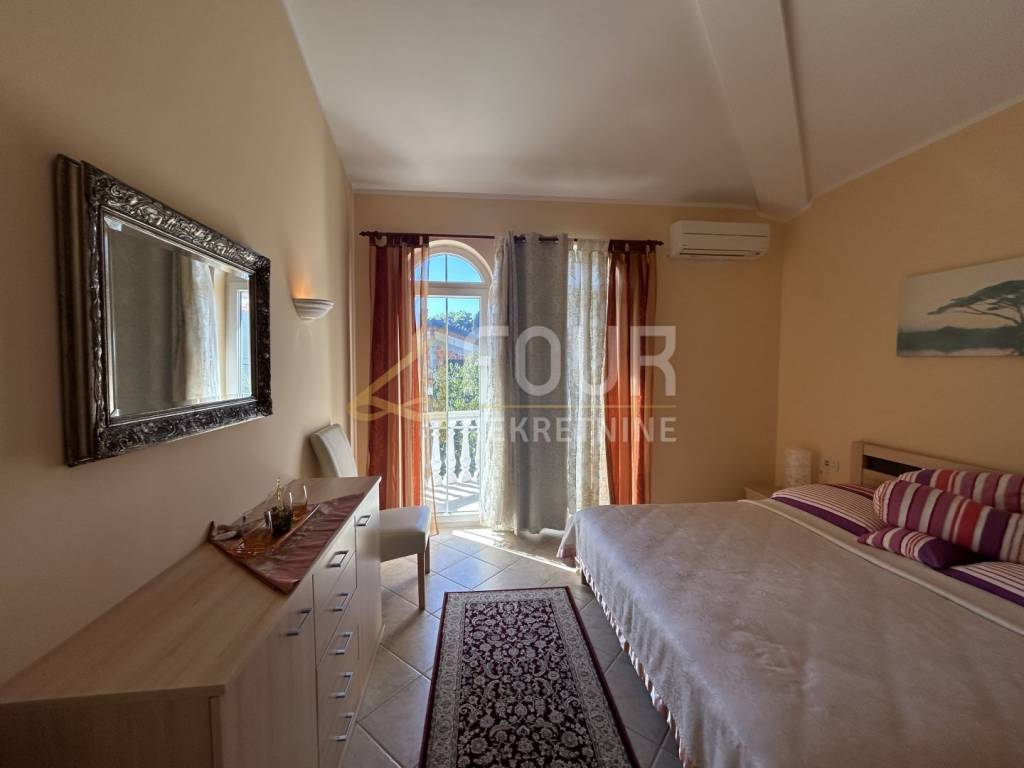 In Premantura, just 400 meters from the sea, a spacious detached house with four apartments, a swimming pool, a large garage, and a landscaped garden is for sale. The house extends over three floors with a total living area of 414 m², situated on a plot of 784 m², and offers stunning sea views from every level.