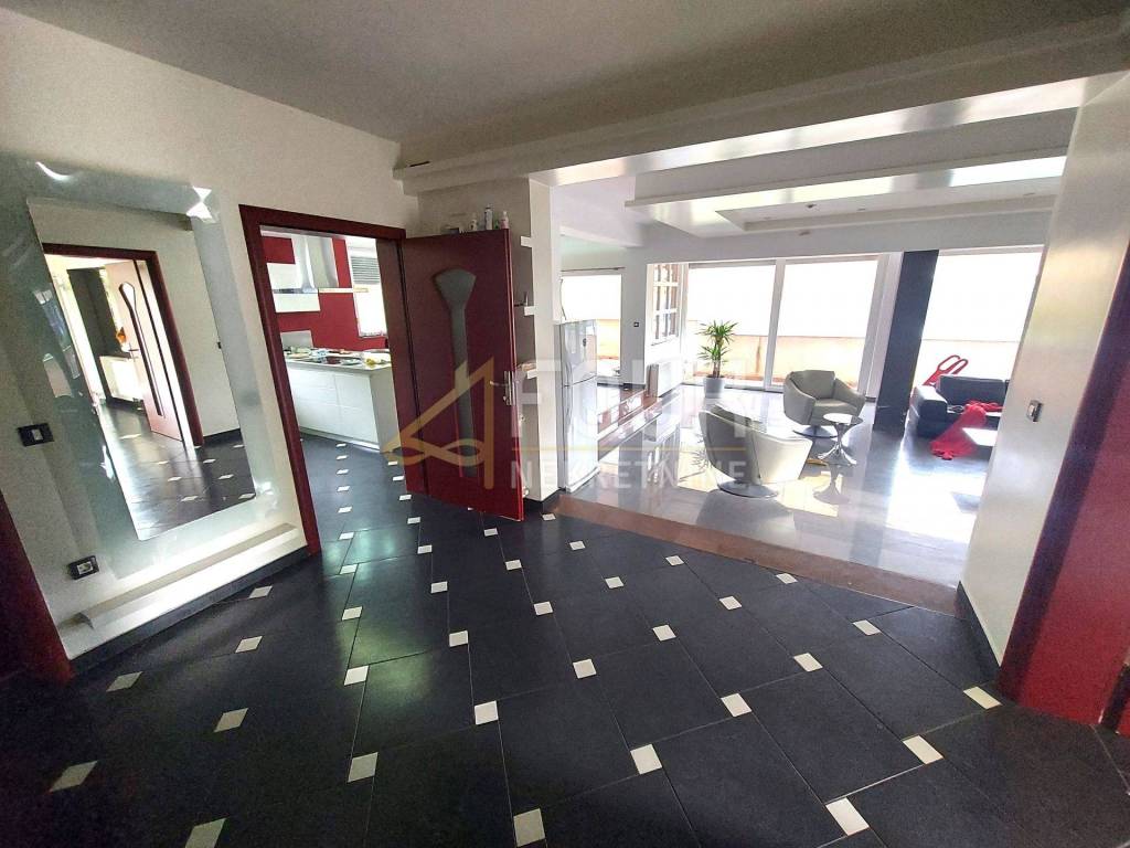 The living room has access to a balcony that extends over the entire floor, while the first floor has a balcony and a roof terrace.