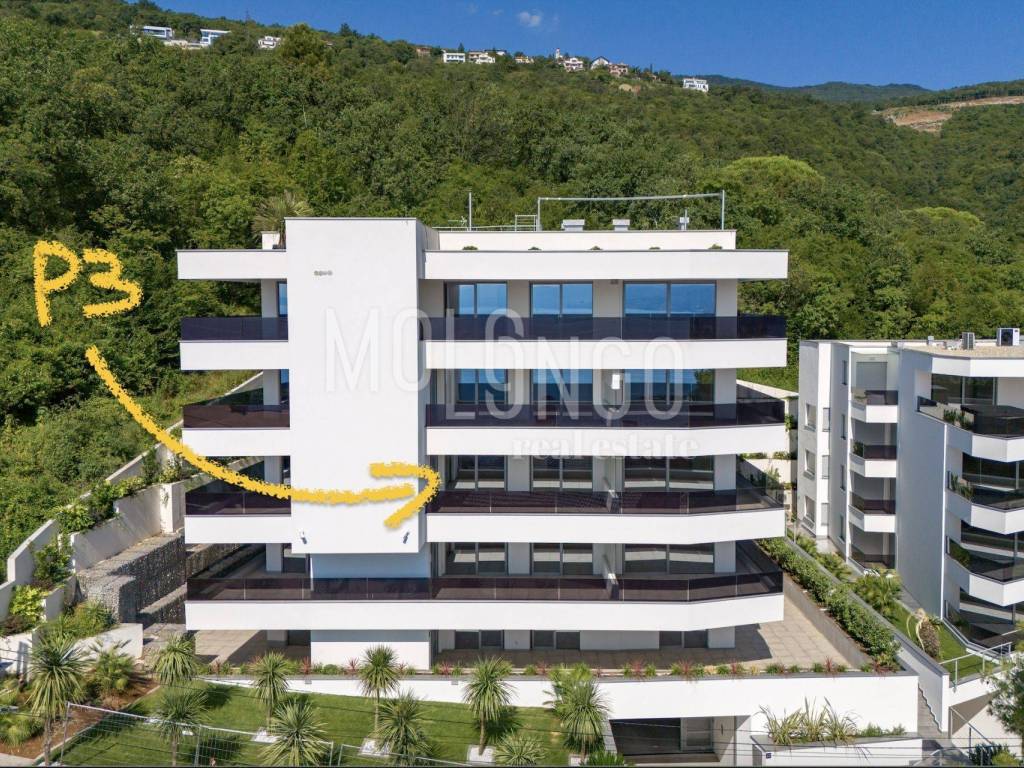 For sale: a luxury 2 bedroom apartment in a new building with a swimming pool, elevator and underground garage in the heart of Opatija, located in an ideal location with a view of the sea.