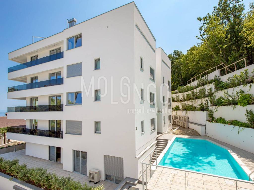 For sale: 2-bedroom + living room apartment in a new building with a pool, elevator, and underground garage in the heart of Opatija, located in an ideal location with a sea view.