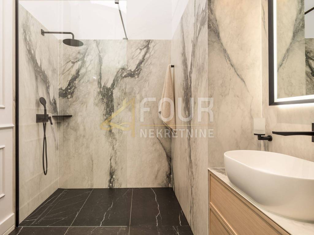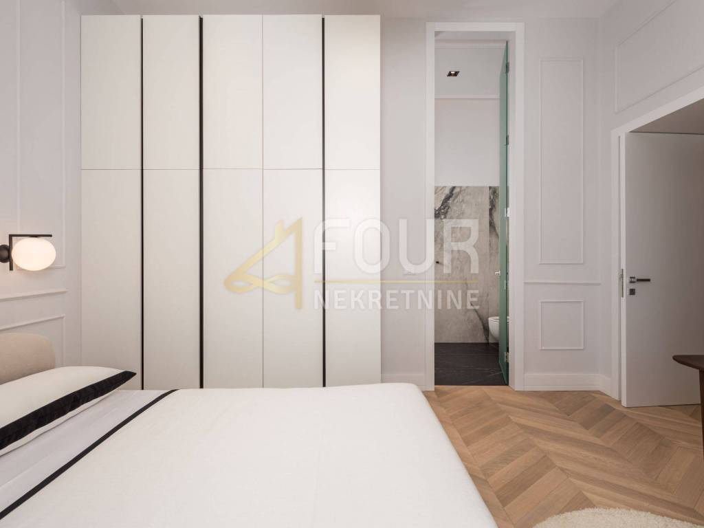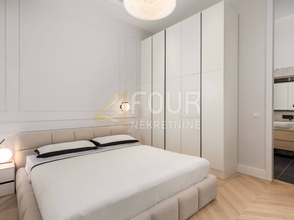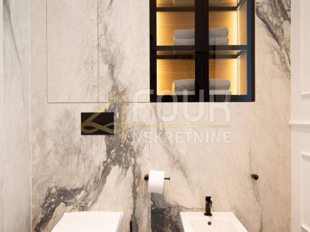 In the first row to the sea, in a building built around 1900, a luxury apartment is offered that represents the ultimate combination of elegance and functionality. Located on the first floor, the apartment consists of a living room with kitchen and dining area and two bedrooms, each with its own bathroom, along with an additional shared bathroom. The property has been renovated and furnished with top quality materials and furniture, and high ceilings and large built-in closets further emphasize the feeling of spaciousness and luxury. Heating is independent, and the quality of the building and apartment make this property ideal for those seeking comfort, prestige, and a luxury lifestyle in Opatija.