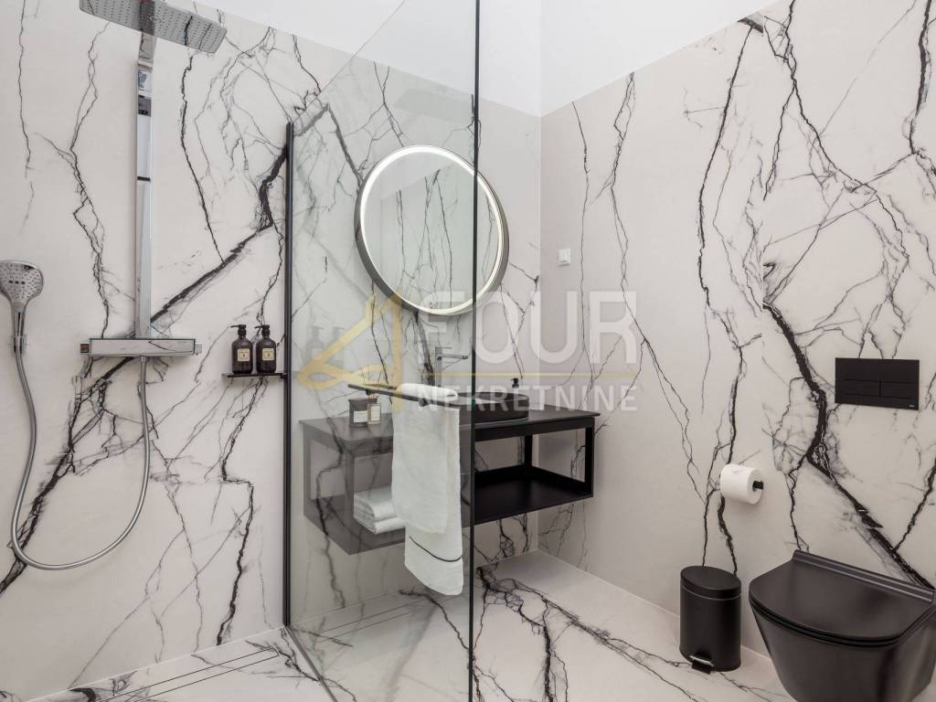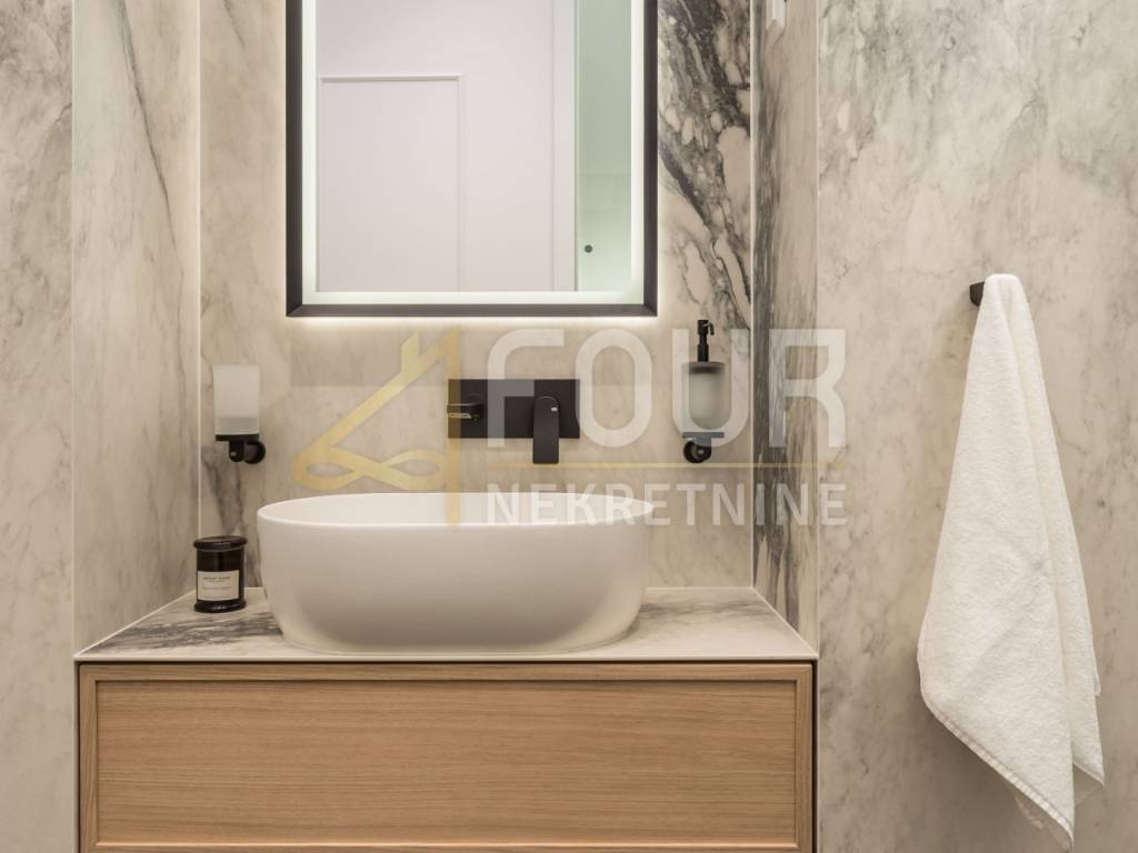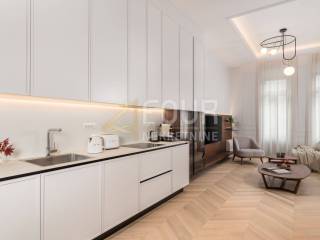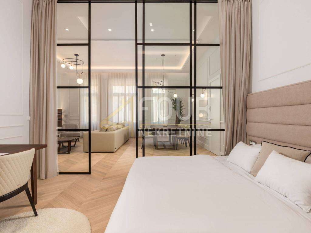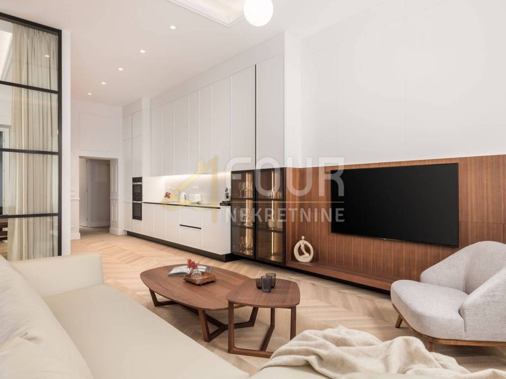 In the first row to the sea, in a building built around 1900, a luxury apartment is offered that represents the ultimate combination of elegance and functionality. Located on the first floor, the apartment consists of a living room with kitchen and dining area and two bedrooms, each with its own bathroom, along with an additional shared bathroom. The property has been renovated and furnished with top quality materials and furniture, and high ceilings and large built-in closets further emphasize the feeling of spaciousness and luxury. Heating is independent, and the quality of the building and apartment make this property ideal for those seeking comfort, prestige, and a luxury lifestyle in Opatija.