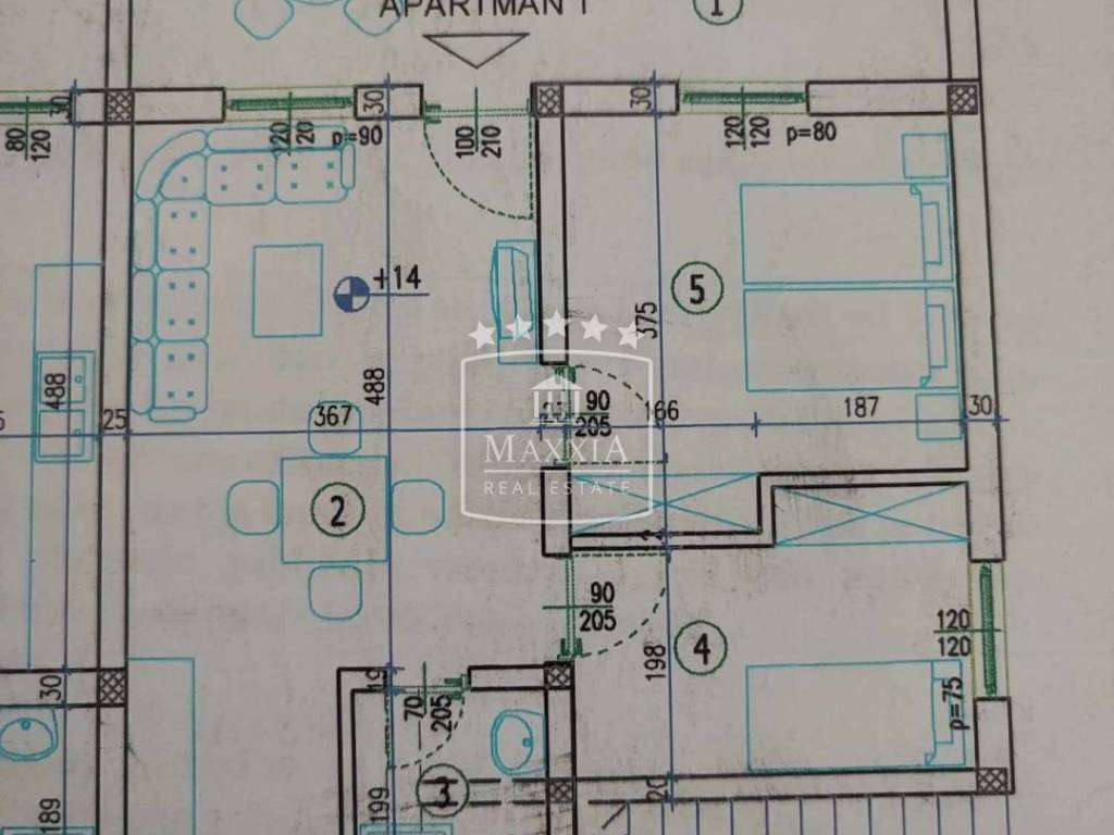 It consists of: - kitchen, - spacious living room with dining room (open space concept) with exit to the terrace, - 2 large bedrooms, - bathroom with a toilet, - spacious terrace with a partial view of the sea.