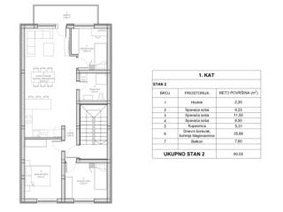 Stan je u na 1.katu i sastoji se od hodnika, dnevnog boravka s kuhinjom i blagovaonicom,
