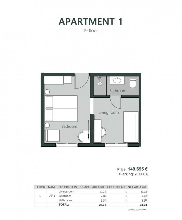 Apartment AP1 consists of one bedroom, a living room that can easily be organized as an additional room, a bathroom and has a total net area of 23.03 m2. It is a functionally designed hotel-type apartment located in a completely renovated building in Crikvenica, developed according to the modern concept of individual ownership with professional hotel management.